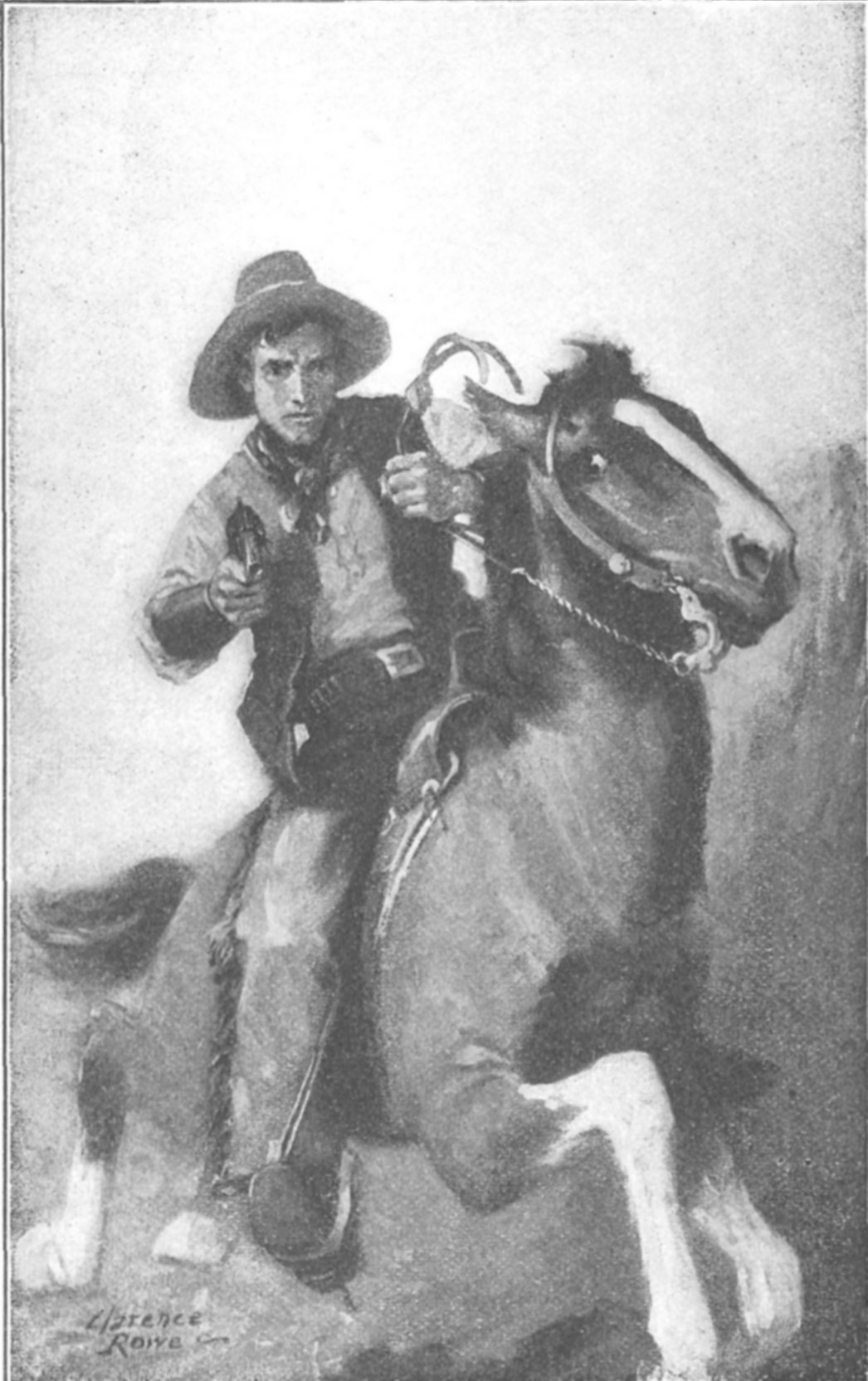 THE RIDER SLEWED IN THE SADDLE WITH HIS WHOLE ATTENTION UPON POSSIBLE PURSUIT. (Page 33)