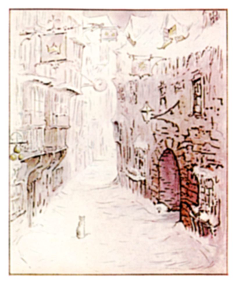 When the Cathedral clock struck twelve there was an answer—like an echo of the chimes—and Simpkin heard it, and came out of the tailor's door, and wandered about in the snow.