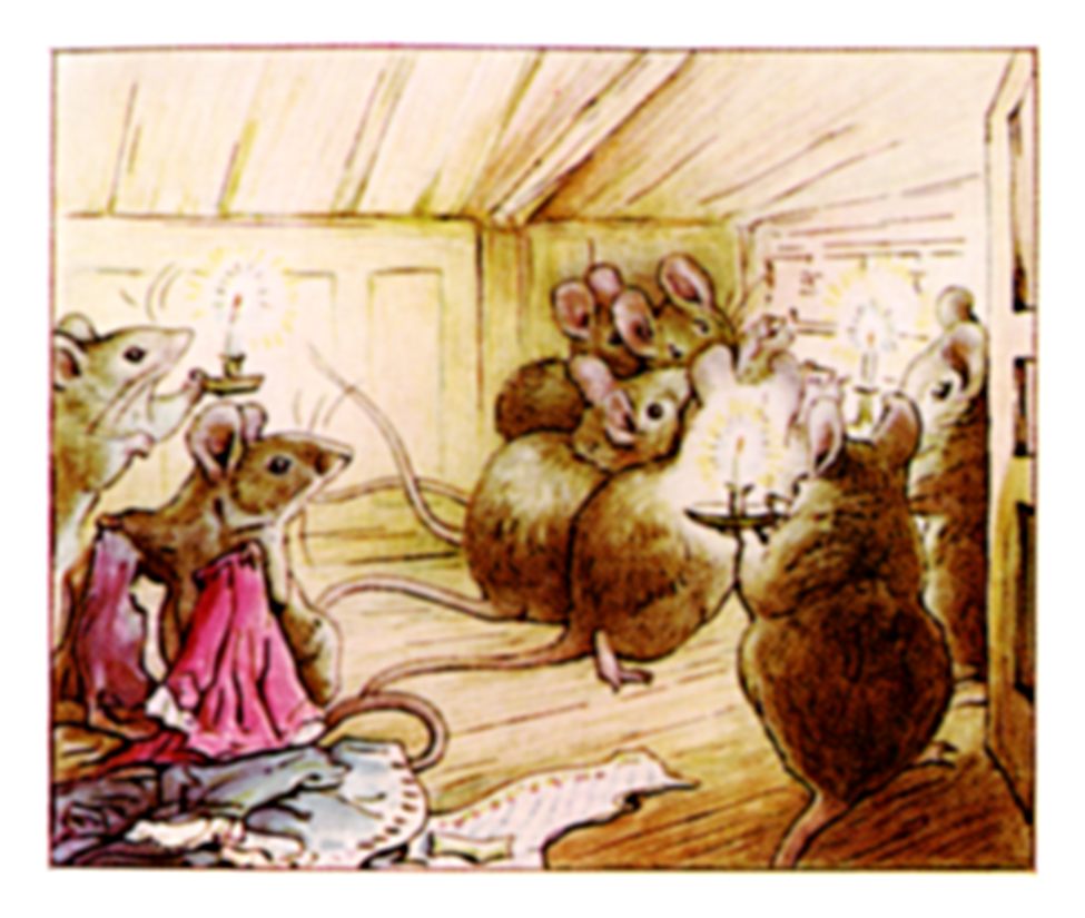 From the tailor's shop in Westgate came a glow of light; and when Simpkin crept up to peep in at the window it was full of candles. There was a snippeting of scissors, and snappeting of thread; and little mouse voices sang loudly and gaily—