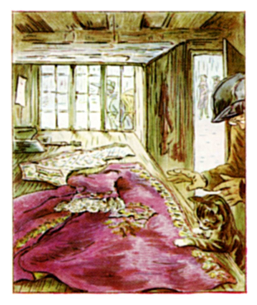 When the tailor awoke in the morning, the first thing which he saw upon the patchwork quilt, was a skein of cherry-coloured twisted silk, and beside his bed stood the repentant Simpkin!
