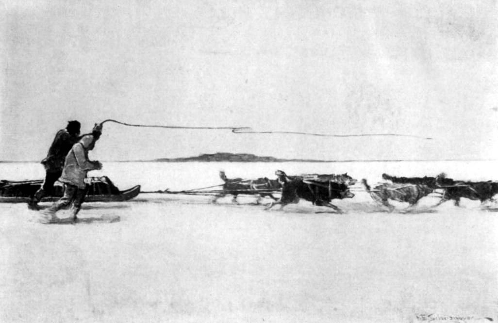 Now, as he jigged a little off shore, he could see Mrs. Abel Zachariah, the yellow sunshine spread all about her, splitting his morning catch on a rude table at the foot of the sloping rocks. Above her stood the little tent that was their summer home, and here and there the big sledge dogs, now idle and lazy and fat, sprawled blissfully upon the rocks enjoying the August morning, for this was their season of rest and plenty.