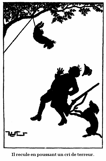 Tout à coup il recule en poussant un cri de terreur: le lièvre hydropique s'est enlevé comme un ballon et a disparu dans les branches de l'arbre.