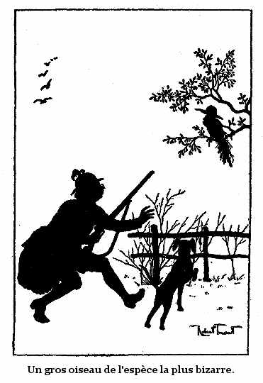 Le plomb a fait balle, le chapeau aux larges bords tournoie dans l'espace; le merle décapité reste perché sur sa branche, comme s'il avait encore son chapeau sur la tête et sa tête sur ses épaules. Peut-être une violente contraction nerveuse rive-t-elle les pattes de l'infortuné à la branche de l'arbre?
