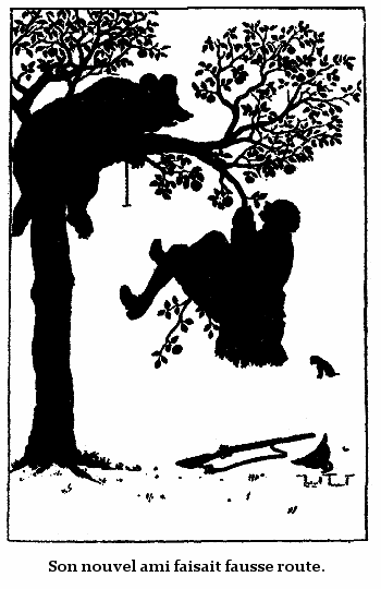 L'ours, qui n'était pas une bête, comprit que son nouvel ami faisait fausse route, et que, s'il persévérait dans cette mauvaise voie, la branche casserait et l'ami se romprait les os. En vain il lui prodiguait les signes, les clins d'oeil; l'autre, qui se méprenait sur ses intentions, battait toujours en retraite. Ce qui devait arriver arriva.