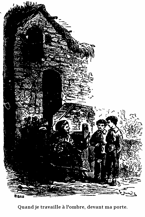 —Mais pas du tout, mes petits enfants. Quand je travaille à l'ombre, devant ma porte, en face de cette belle pièce de blé que voilà, descendant jusqu'à la verte prairie; quand je regarde les vignes qui, de l'autre côté de l'eau, vont en montant jusqu'au grand bois, je me trouve bien plus heureuse que si j'étais dans vos belles chambres, qu'il faut toujours tenir fermées afin que l'air n'altère pas la couleur des meubles. Au lieu qu'ici je vois le ciel bleu, et le beau soleil du bon Dieu qui réjouit tout autour de moi. Ça me fait penser plus souvent à lui, et je me sens toute contente.»