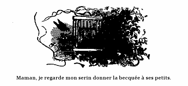 —Maman, je regarde mon serin donner la becquée à ses petits. Voyez-les ouvrir le bec, tous à la fois! Croyez-vous qu'il les appâte régulièrement les uns après les autres, ou bien laisse-t-il prendre la pâture plus souvent à ce petit glouton qui se met toujours devant ses frères?