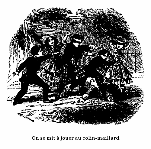Les enfants de M. Raynouard invitèrent un de leurs camarades à venir passer la journée avec eux. Après avoir essayé de tous les jeux, on se mit à jouer au colin-maillard. Quand ce fut le tour du camarade d'avoir les yeux bandés, les enfants s'entendirent pour quitter l'endroit où il était, et le laissèrent tout seul, cherchant dans tous les coins sans trouver personne.