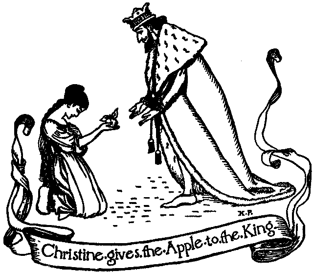 "Never mind," said they; "we still have the apple of contentment at home, though we cannot taste of it." But no; they had nothing of the kind. The next morning it stood before the young Queen Christine's window, just as it had at her old home, for it belonged to her and to no one else in all of the world. That was lucky for the King, for he needed a taste of it now and then as much as anybody else, and no one could pluck it for him but Christine.