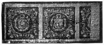 Another interesting stamp was issued in the island of Trinidad in 1855. In this case, the stone, after the designs had been placed upon it, was very deeply bitten with acid, so that it might properly be called etched and the impressions from it be said to be typographed from stone. This stone was used in 1855, 1858 and 1860. Owing to its friable nature and want of care the stone deteriorated, so that the last impressions from it are little better than blurs.