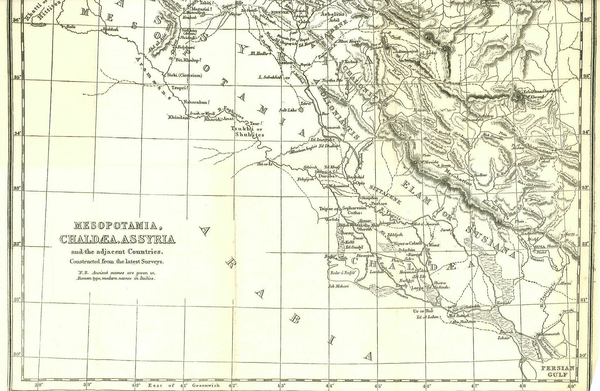 The division, which has here forced itself upon our notice, between the Upper and the Lower Mesopotamian country, is one very necessary to engage our attention in connection with the ancient Chaldaea. There is no reason to think that the terns Chaldaea had at anytime the extensive signification of Mesopotamia, much less that it applied to the entire flat country between the desert and the mountains. Chaldaea was not the whole, but a part of, the great Mesopotamian plain; which was ample enough to contain within it three or four considerable monarchies. According to the combined testimony of geographers and historians, Chaldaea lay towards the south, for it bordered upon the Persian Gulf; and towards the west, for it adjoined Arabia. If we are called upon to fix more accurately its boundaries, which, like those of most countries without strong natural frontiers, suffered many fluctuations, we are perhaps entitled to say that the Persian Gulf on the south, the Tigris on the east, the Arabian desert on the west, and the limit between Upper and Lower Mesopotamia on the north, formed the natural bounds, which were never greatly exceeded and never much infringed upon. These boundaries are for the most part tolerably clear, though the northern only is invariable. Natural causes, hereafter to be mentioned more particularly, are perpetually varying the course of the Tigris, the shore of the Persian Gulf, and the line of demarcation between the sands of Arabia and the verdure of the Euphrates valley. But nature has set a permanent mark, half way down the Mesopotamian lowland, by a difference of geological structure, which is very conspicuous. Near Hit on the Euphrates, and a little below Samarah on the Tigris, the traveller who descends the streams, bids adieu to a somewhat waving and slightly elevated plain of secondary formation, and enters on the dead flat and low level of the mere alluvium. The line thus formed is marked and invariable; it constitutes the only natural division between the upper and lower portions of the valley; and both probability and history point to it as the actual boundary between Chaldaea and her northern neighbor.