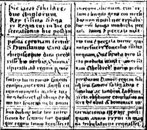[Footnote 2: "Here lieth Ethelred, King of the English, son of King Edgar, to whom, on the day of his hallowing, St. Dunstan, the archbishop, after placing the crown upon him, is said to have foretold terrible things in these words: Forasmuch as thou hast aspired to the Kingdom through the death of thy brother, against whom the English have conspired along with thy wretched mother, the sword shall not depart from thy house, raging against thee all the days of thy life, destroying thy seed until the day when thy Kingdom shall be conveyed to another Kingdom whose customs and language the race over whom thou rulest knoweth not; nor shall there be expiation save by long-continued penalty of the sin of thyself, of thy mother, and of those men who took part in that shameful deed. Which things came to pass even as that holy man foretold; for Ethelred being worn out and put to flight in many battles by Sweyn, King of the Danes, and his son Cnut, and at last, closely besieged in London, died miserably in the year of the Incarnation 1017, after a reign of 36 years of great tribulation."]