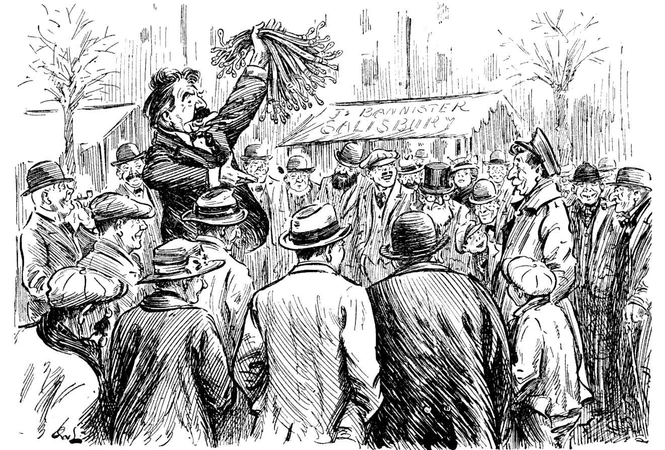 Auctioneer. "Come, gents, how much for these dozen braces?"