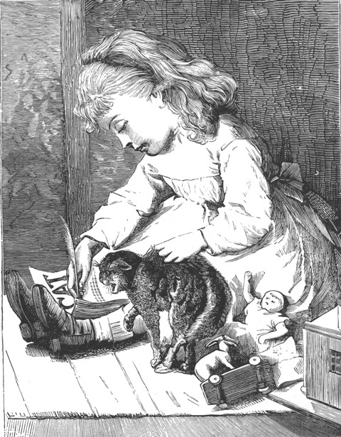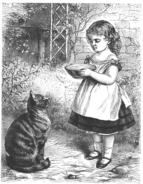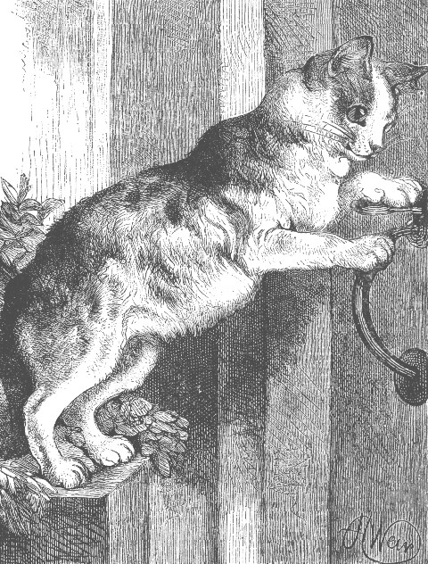 Topsy had four kittens, but as it was settled that we could not keep more than one, and little Milly Knight wanting one, the other two had to be drowned. So Milly came one day and selected a nice little black and white one. We were very sorry when Tom took the little creatures and put them in the pond at the bottom of the garden. As they were very young and could not feel much, we thought Topsy would soon forget them. Well, on the evening that they were drowned, while the cook was in her pantry, with the window open, she saw something come rushing along, and, in another minute, Topsy leaped through the window, carrying in her mouth one of the kittens, dripping wet, which she laid on the mat and began to lick with all her might. And how she licked it! Over and over, and over again, till, as the cook said, she "licked it into life." The little kitten got well, and became, owing to its narrow escape, and the love displayed, a great pet ever afterward.