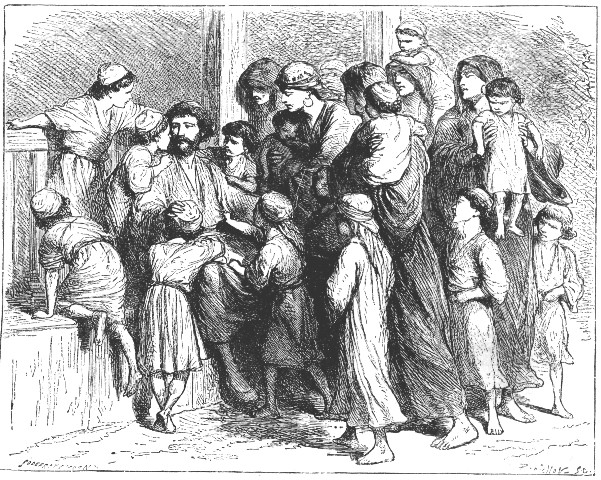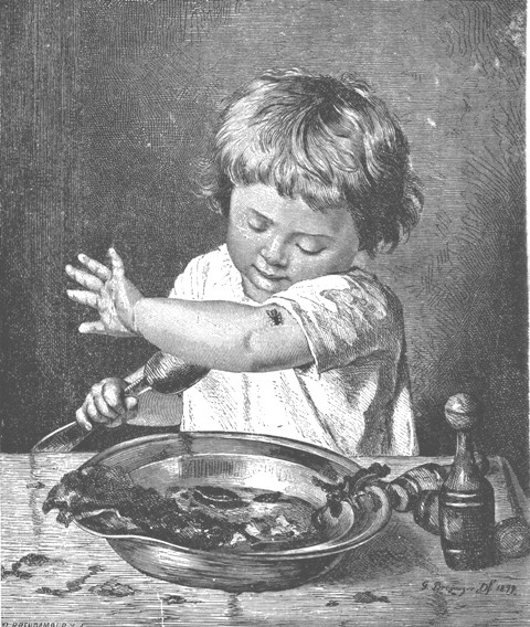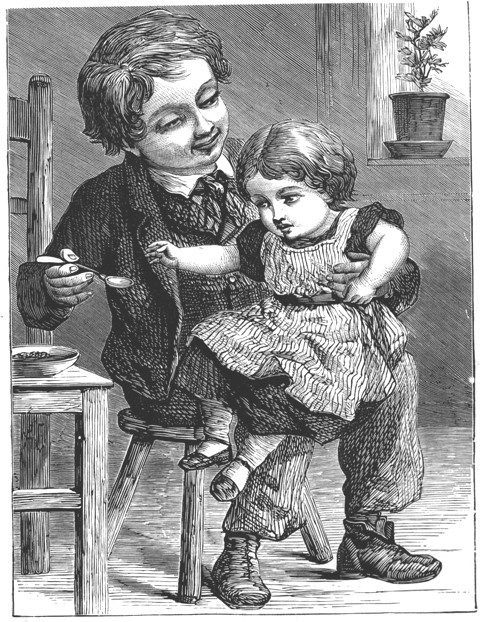 The children are fond of a merry tune, so they have given the organ-boy a penny to play. The babies stare at the organ, as though they thought it a very funny box to make such a noise. One little child, with a doll in her arms, is giving a piece of bread to the monkey, but he looks as if he suspected it was a trick. The boy has a cloth over his organ, to protect it when it rains. I do not like to see monkeys led about in this way. I think it is cruel, and must cause them much suffering, especially if they have a cruel master. But I think this little boy will be kind to his little companion, and not twist and throw it about as some of the men do. Monkeys are very amusing, after they go through a short training, and will do all manner of tricks for their master.