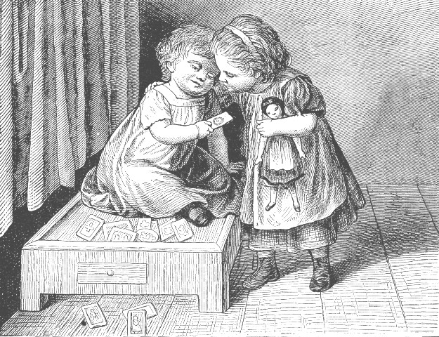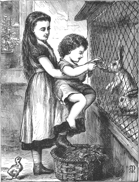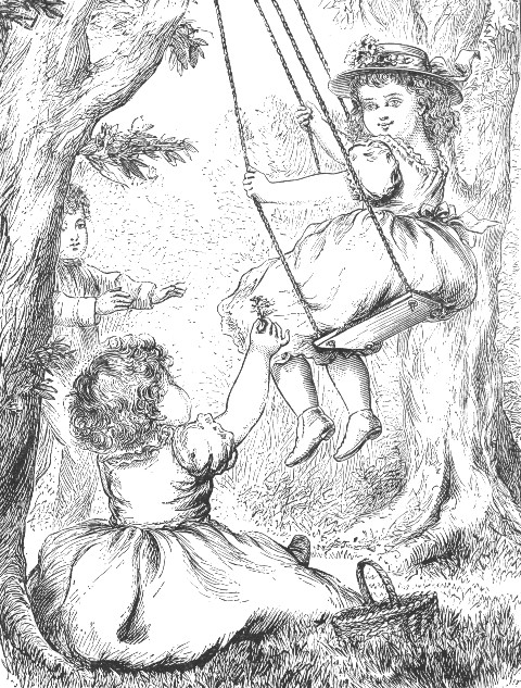 Little Elsie and Gertie live in the country. They do not see the gay shops full of pretty things that amuse children in New York, and they have never been to a bazaar, or to the Zoological Gardens, but they have sweet flowers to smell and look at, and live creatures about them at home. They find amusements at all seasons of the year, and are very merry. You see them now in the field where the grass has been cut and is drying into hay that the horses and cows will eat. The children have had fine fun in the hay; they have spread and tossed it, and Gertie has pretended to feed her toy goat with it, and now she wants Elsie to hide her in it that she may jump out and surprise James their brother, who is coming in at the gate.