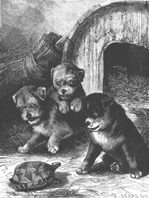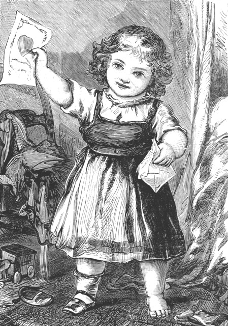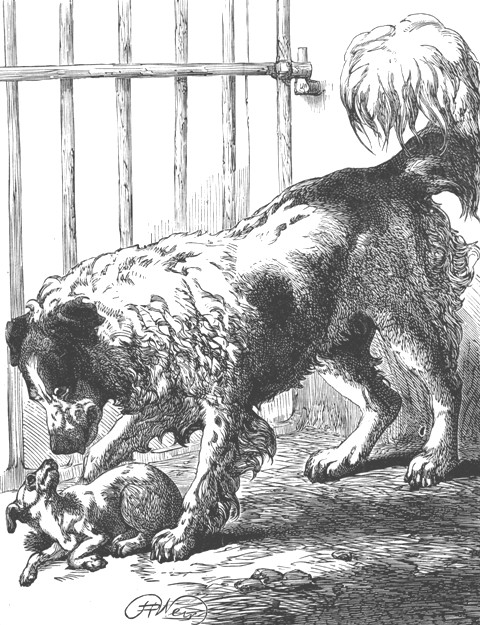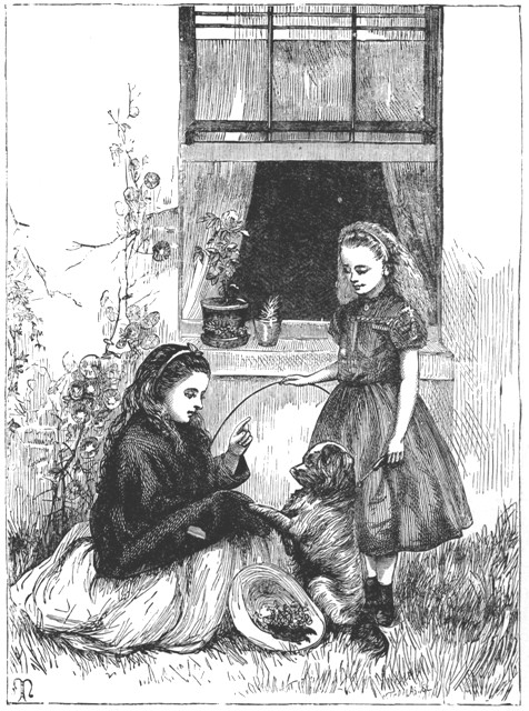 One evening, nurse had put baby to bed, and tucked her in quite snug and warm. Having to do some shopping, nurse went out, and, in going along the street she felt something pulling her skirt, and on looking down discovered Tray with her skirt in his mouth. Nurse thought he was only playing, and tried to shake him off, but he began to bark and whine, and seemed to say, in his doggish way: "Please do attend to me; do come back with me!" that at last, just to see if he would leave off, she began to walk home. And oh, how delighted Tray was! When they reached the house Tray ran up-stairs, and nurse discovered baby sitting up in bed, and screaming sadly. The little thing had awoke, and finding herself alone, began to cry; and the faithful dog had heard her, and set off directly to find nurse.