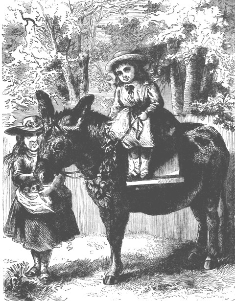 "Oh, papa! will you please buy me a donkey?" said little Ella Clark to her father, as she ran to meet him. "Well," said her father, "if you will promise to be a very good girl, and give your sister May a share of the rides, I will get one in the city and send it home." So, in a few days the donkey came, with a new bridle and saddle. The next thing to do was to give him a name; so, after trying a great many they agreed to call him "Jack." The next day Ella and May were up early and went to the barn, where they found Henry, and asked him to saddle "Jack." Henry brushed down "Jack's" thick coat of hair, and made him look quite trim, and he then placed Ella on "Jack's" back, and walked him up and down, holding on to Ella, and in a short time she could ride alone, and felt as proud as a queen when her father saw her sitting up on "Jack's" back. She then gave May a ride, and at last got so bold as to take "Jack" down the lane alone, and had a splendid time riding up and down.