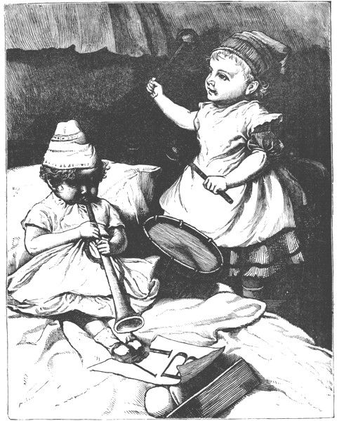 Rub-a-dub, rub-a-dee, Oh, such jolly fun! I'm Signor Blowmore, And he's Herr Bertrun. Rub-a-dub, rub-a-dee! Do we make a noise? That's the very thing you know Pleases little boys. Rub-a-dub, rub-a-dee! Full of young life's joys, Playing with the horn and drum, Best of all the toys. Rub-a-dub, rub-a-dee! Music now hath charms; You can blow and beat away, And it no one alarms. |