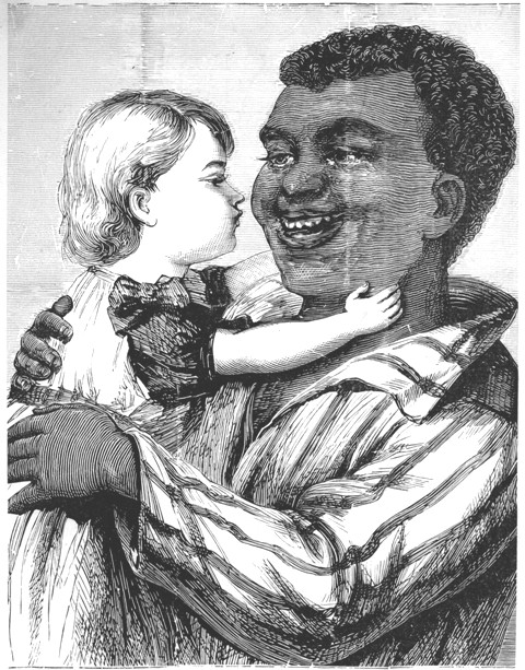 When I was a very little girl, one of my best friends was Washington Henry. He was one of our servants, who made himself useful inside of the house, and was as black as night, as you may see by the picture. He liked nothing better than to meet me outside the house and have a romp, and he would take me all round the barn and show me the ducks, and hens, and the nice little chickens, and wheel me round in the baby-carriage, while he capered and danced about like a high-mettled steed. I can tell you we had plenty of fun, and father often used to wonder how it was I liked Washington so much, but it was only because he was more kind and considerate than any of the other servants. His old mother lived in a little cottage with his younger brother and sister, and he used to take me round there sometimes, and they had always something new to show me.