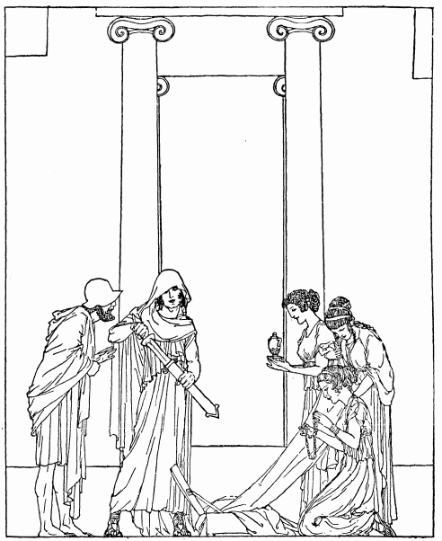 'My nurse,' said he, 'none but yourself must know what I would do now, and you must swear not to speak of it to my lady-mother until twelve days from this. Fill twelve jars with wine for me now, and pour twelve measures of barley-meal into well-sewn skins. Leave them all together for me, and when my mother goes into the upper chamber, I shall have them carried away. Lo, nurse, I go to Pylos and to Sparta to seek tidings from Nestor and Menelaus of Odysseus, my father.'