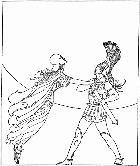 Now as the two bands came close to each other—Odysseus with Telemachus and Laertes; with the swineherd and the cattleherd; with Dolius, Laertes' servant, and with the six sons of Dolius—and Eupeithes with his friends—a great figure came between. It was the figure of a tall, fair and splendid woman. Odysseus knew her for the goddess Pallas Athene.