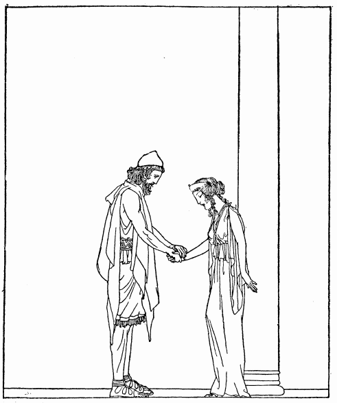 Saying this she took Penelope by the hand and led her from the upper chamber into the hall. Odysseus was standing by a tall pillar. He waited there for his wife to come and speak to him. But Penelope stood still, and gazed long upon him, and made no step towards him.