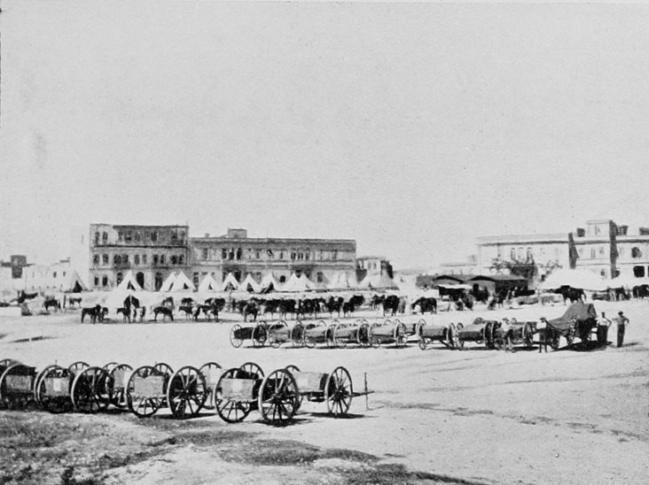 Each "G.S." (general service) limbered wagon is designed to carry about a ton, and is drawn by 4 mules. On this occasion, however, 4 cwts. was the maximum load, and for this 6 mules were required in every case. In spite of such a team, the going was hard enough, in very truth, and sore shoulders were not uncommon, owing to the mules being so "soft," and the new breast-collars so hard!