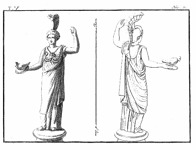 FIG. IV. Autre Minerve, curieuse par le cimier aîlé qu'elle porte sur la tête. On trouve sur quelques gemmes des figures de Minerve avec des aîles au cimier, emblême de la vélocité et d'une irrésistible impétuosité. L'égide de côté se rapporte au même sens; la Déesse la porte toujours ainsi lorsqu'elle est aîlée. Le casque de Minerve est aîlé sur presque toutes les médailles d'argent de la République Romaine. Les Etrusques donnaient aussi des aîles leurs Minerves, quelques fois sur le cimier, quelques fois aux épaules; ici le cimier a la forme du bonnet phrygien. On le voit de même dans un vase étrusque publié par Demster (tome I, pl. 30 et 32).