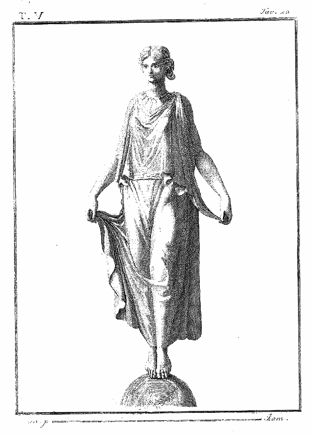 Le petit peplum des femmes grecques n'était pas toujours succinct; il avait quelquefois des aîles qui descendaient jusqu'aux talons. Dans notre bronze, on voit le manteau court par devant, tomber par derrière jusqu'à terre. C'est une prêtresse ou une femme représentée dans une action religieuse. L'attitude des mains renversées et tournées vers le ciel, pourrait se rapporter à la prière; mais elle n'est cependant pas assez prononcée pour qu'on y reconnaisse absolument cet acte de piété. La prière se trouve indiquée sans équivoque dans d'autres figures de femmes, auxquelles Pline a donné le nom d'adorantes, et dont M. Visconti a indiqué dans ses œuvres plusieurs copies antiques: un objet que tiendrait la figure entre ses mains, comme une bandeau sacré (vitta ou infula) pourrait aussi expliquer son attitude. Les figures précédentes sont pieds nus; celle-ci porte une espèce de sandales pour chaussure.
