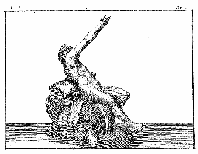 À ses grosses lèvres et à son nez écrasé, on reconnaît, dans cette petite figure, un Éthiopien, ou du-moins un homme de quelqu'une de ces nations africaines, que les anciens confondaient, à raison de leur ressemblance entr'elles, et de leur voisinage. Ces nations fournissaient le monde de saltimbanques, qui faisaient métier de leur souplesse et de leur adresse. On les appelait dans les festins pour servir de divertissement. Lucien peint ainsi un petit homme difforme, dansant, faisant mille contorsions, récitant des vers avec des gestes ridicules, et affectant la prononciation égyptienne. Celui-ci représente la même action; il a pour vêtement une espèce de chemise sans manches, qu'Arrien donne pour vêtement aux Indiens (Hist. Ind. 16, p. 380.)