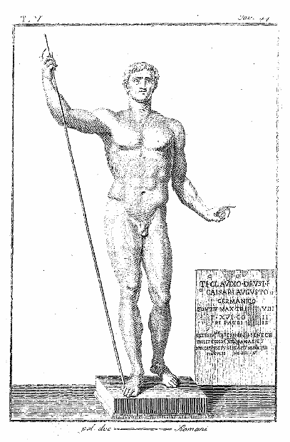 Cette autre statue colossale, érigée en l'honneur de l'empereur Claude, est d'un excellent travail, et fut trouvée avec celle d'Auguste dans le même lieu. Auguste est représenté comme une divinité, et Claude comme un héros; c'est ce qui paraît par la nudité totale du corps et le sceptre ou bâton de lance (hasta pura) sur laquelle il s'appuie. Le bâton de lance était originairement un prix décerné à la valeur par les généraux romains (Polybe VI, 37); il devint ensuite un signe d'honneur: on remarque ce signe sur les médailles qu'Auguste fit frapper en l'honneur de ses petits-fils, Lucius et Caïus Cæsar, princes de la jeunesse. Le bâton de lance et la nudité distinguaient les statues héroïques auxquelles les jeunes gens des gymnases servaient de modèles, et qu'on nommait du nom d'Achille, achilleæ (Plin. XXXIV, 5.) L'empereur porte au doigt annulaire une bague avec le signe du lituus, comme dans le premier bronze. L'inscription qu'on a trouvée sur une lame de bronze qui revêtissait la base sur laquelle la statue était posée, confirme les rapprochemens que l'on peut faire de la tête avec les traits connus de Claude. Voici l'inscription telle qu'elle est figurée sur la base, avec les lettres suppléées pour en donner le sens parfait: