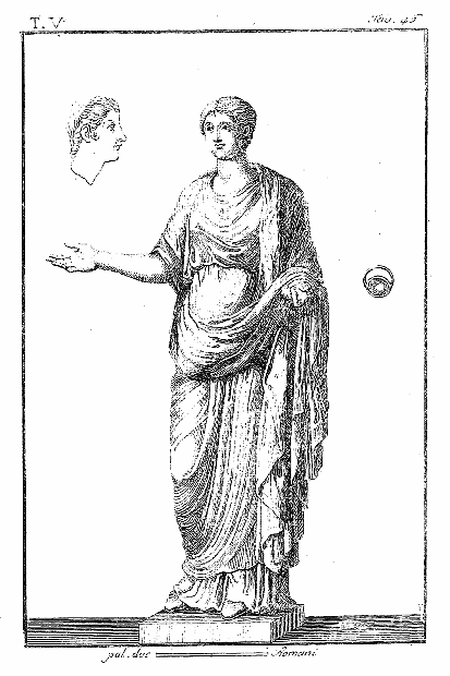 Cette statue excède les proportions humaines; le sujet nous en est inconnu, et nous nous bornerons à en considérer le mérite comme ouvrage de l'art. La beauté du travail brille sur-tout dans l'agencement des draperies; toute la figure respire un air de gravité qui semble convenir à un personnage sacré; la situation des mains se rapporte à quelque cérémonie, et semble ranger, selon l'opinion de M. Visconti, cette statue parmi celles que Pline désigne sous le nom d'Adorantes, femmes en prière. Nous avons déjà fait la même remarque à l'égard de la statue expliquée pl. XLII de ce volume. Nous ajouterons que l'on voit des statues érigées aux épouses des Empereurs romains, dans cette même attitude. Telle est la Livie du musée du Vatican, trouvée à Otricoli, qui fait le pendant de la statue d'Auguste voilé, c'est-à-dire, en habit de sacrificateur. Si la physionomie de la tête ne laisse pas reconnaître ici une Impératrice, ce sera quelque femme de l'une des familles les plus nobles et les plus puissantes de la Campanie, telles que la Calatoria, Mammia, Nonia, etc.
