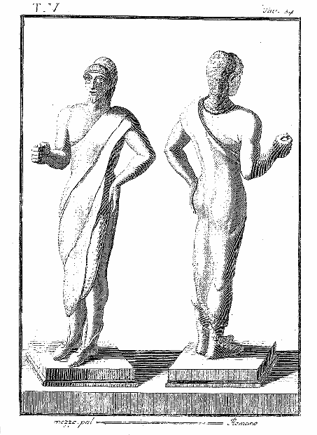 Ce bronze curieux n'est point un produit des fouilles d'Herculanum ni des environs; mais il a mérité une place parmi les monumens les plus précieux rassemblés au musée de Portici. Il fut trouvé, en 1764, dans l'île d'Elbe, sur les confins du territoire de Rio, entre Longone et Porto-Ferrajo, dans l'ancien port, célèbre sous le nom d'Argo, qu'on croit avoir été ainsi appelé du vaisseau des Argonautes qui y relâchèrent dans leur voyage. On reconnaît, dans ce bronze, le style étrusque pris l'époque la plus reculée, se rapprochant, dans sa simplicité et dans sa timidité, du style égyptien, dont le caractère principal est d'accoler au corps les bras et les jambes, et d'unir les doigts des pieds et des mains, souvent d'une longueur démesurée. Ce rapport qu'offre le goût dans les arts apportés en Italie par les Colonies grecques, avec le goût des Égyptiens, est le monument le plus irrécusable qui décèle la source des premières inventions, quoique la Grèce, ingénieuse et jalouse, en ait fait disparaître la trace par la perfection qui, d'un art humain, a fait un art presque divin. La toge qui sert d'habit à la figure, était propre aux Toscans auxquels les Romains l'ont depuis empruntée. Elle était, dans l'origine, étroite et ouverte; elle enveloppait le corps, et, laissant libres le bras et l'épaule droite, elle revenait sur l'épaule gauche. Toga picta exprimait l'ornement en broderie, qu'on appelait peint à cause de sa perfection; cet ornement est tracé avec soin sur notre bronze. Les sandales sont aussi une chaussure tout-à-fait étrusque. Le sujet de ce bronze, peu facile à déterminer, est vraisemblablement une idole qui correspond au lieu où elle a été trouvée. On croit que l'île d'Elbe, nommée Ilva par les Latins, Æthalia par les Grecs, a été habitée par une Colonie de la ville de Populonia, sur la côte opposée de l'Étrurie. Si la Colonie apporta le culte de ses dieux, dont les principaux paraissent avoir été Minerve, Mercure et Vulcain, ce dernier fut probablement le plus honoré dans l'île d'Elbe, dont la richesse est toute entière dans ses mines: il serait donc possible que cette figure fût celle de Vulcain ou d'un Cabire.