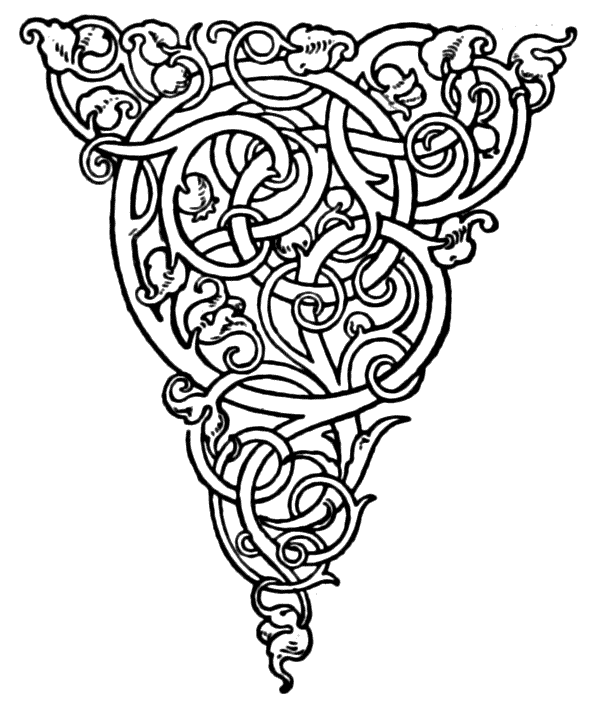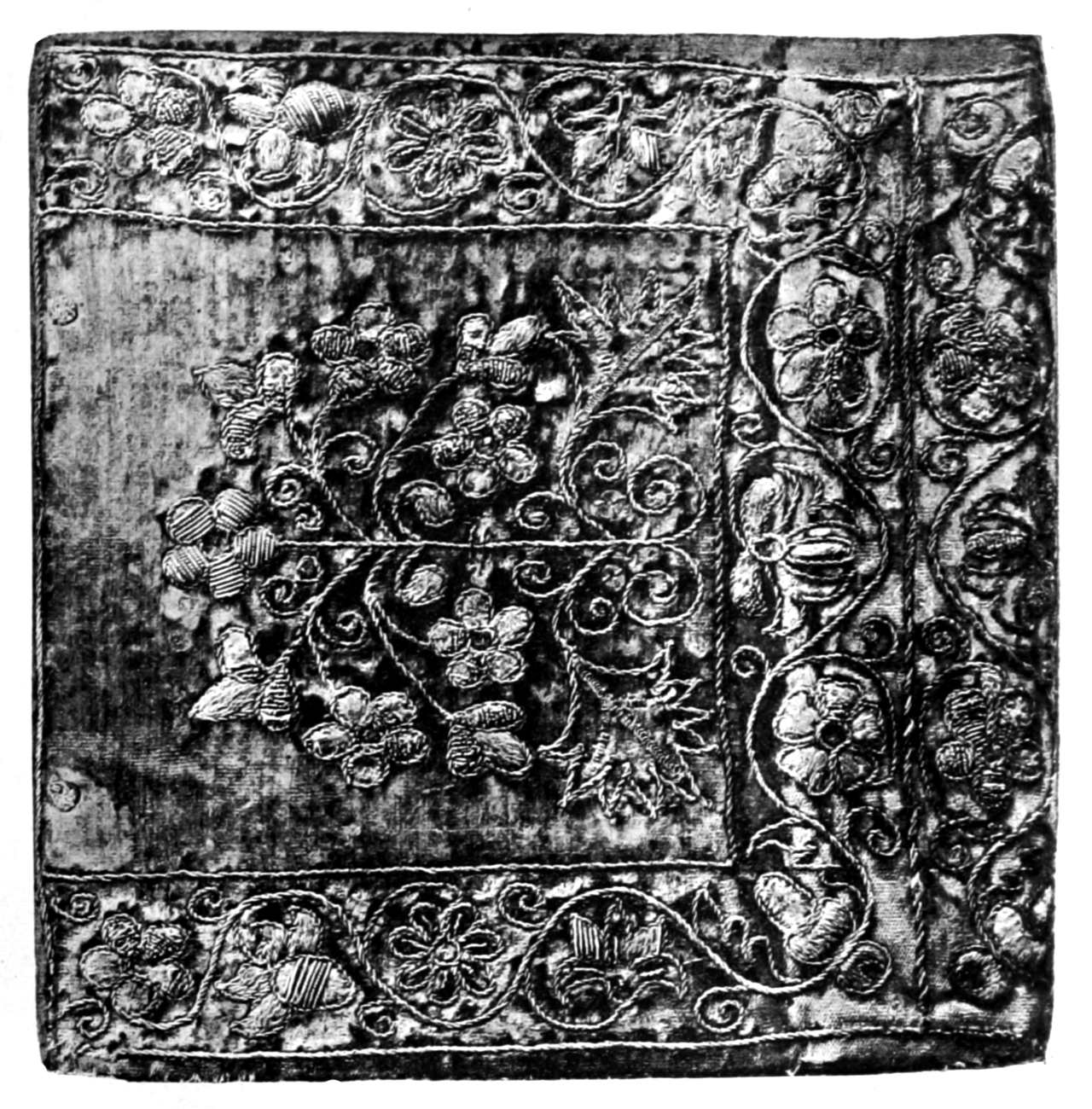 The petals of the flowers are worked in guimp, whether gold or silver is difficult to say. Indeed in many instances of the older books it is difficult to be sure whether a metal cord or thread was originally gilded or not, as all these 'gold' threads are, or were, silver gilt, so that when worn the silver only remains. If the cord or thread has been protected in any corners, however, or if it 67can be lifted a little, the faint trace of gold can often be seen on what would otherwise have been surely put down as originally silver.