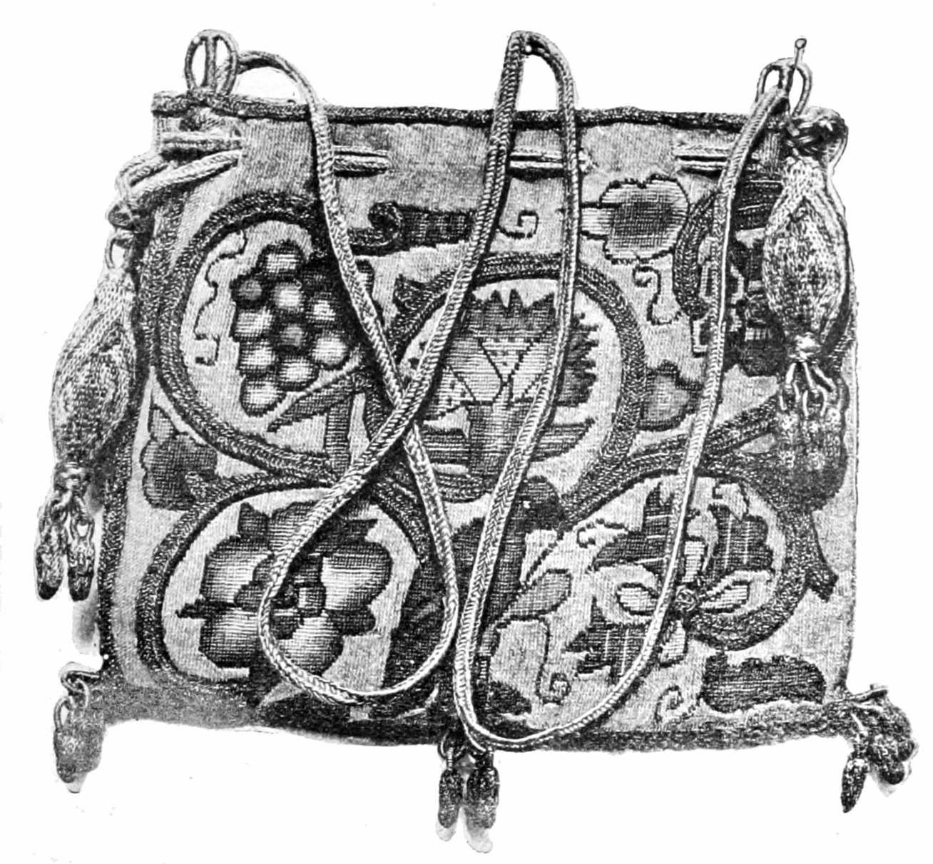A charming little piece of delicate workmanship occurs in a copy of the Psalms, printed in London in 1639, and bound in white satin. It measures 3 by 2 inches. The design on each side is the same, but the work is slightly different. A tall rose-tree, with gold stem, grows from a small chenille base, the rose petals beautifully worked in the finest of stitches, as well as the leaves, all of which are outlined with fine gold thread. From the lower branches of the rose-tree hang on one side a violet, and on the other a pansy, each worked in the same way as the rose, and edged with fine gold thread. The back is divided into four panels, containing respectively a cornflower, a pomegranate, a fruit, perhaps meant for an apple, and a honeysuckle, all conventionally treated and very delicately worked. The edge is bound all round with a strong braid, and there is one tie of broad, cherry-silk ribbon. With this book is its canvas bag, embroidered in silver ground with coloured-silk flowers and tassels of silver, the general design and workmanship of which nearly resembles that of the finer bag already described at page 16. The silver has turned nearly black, as is usually the case with these bags.