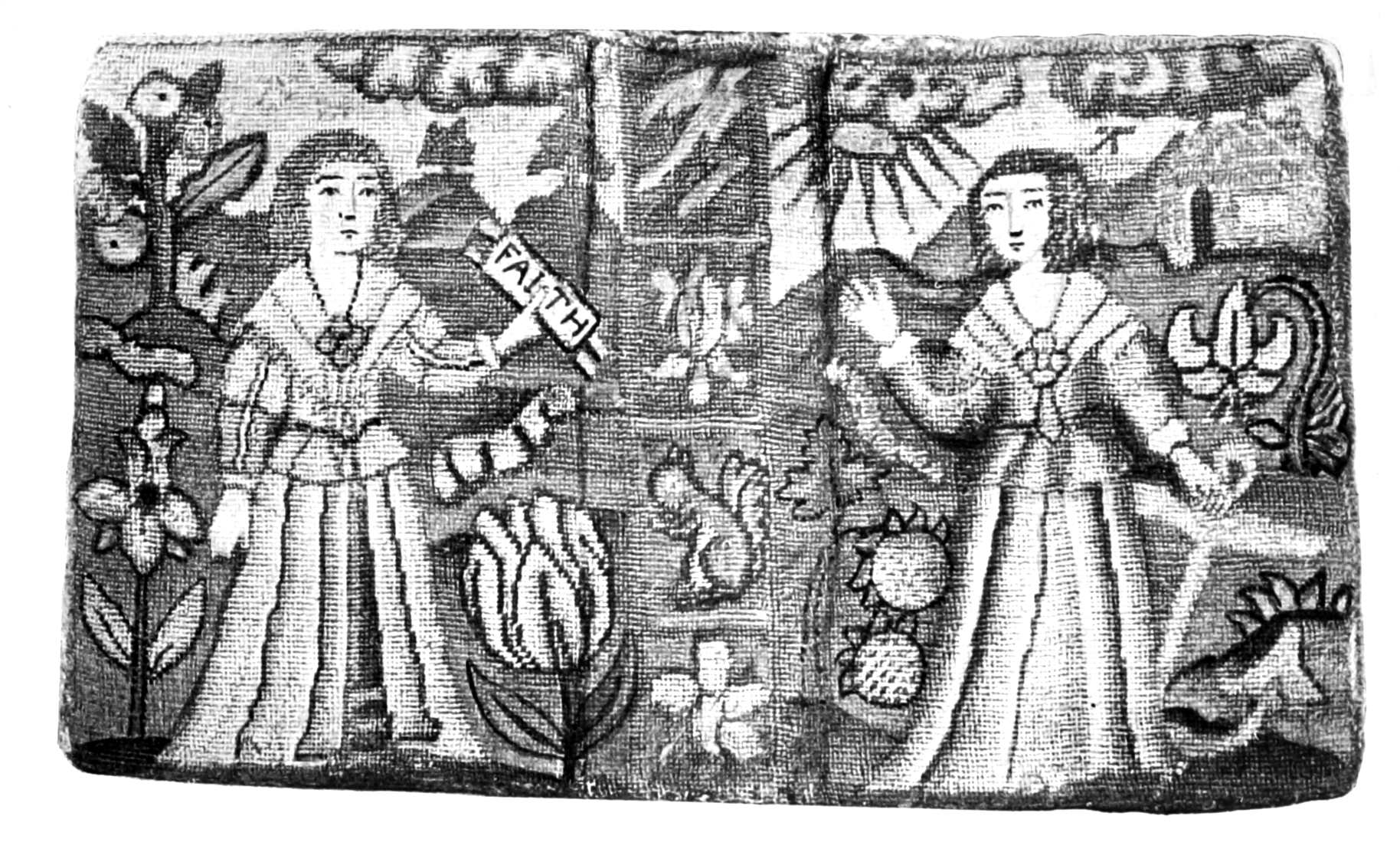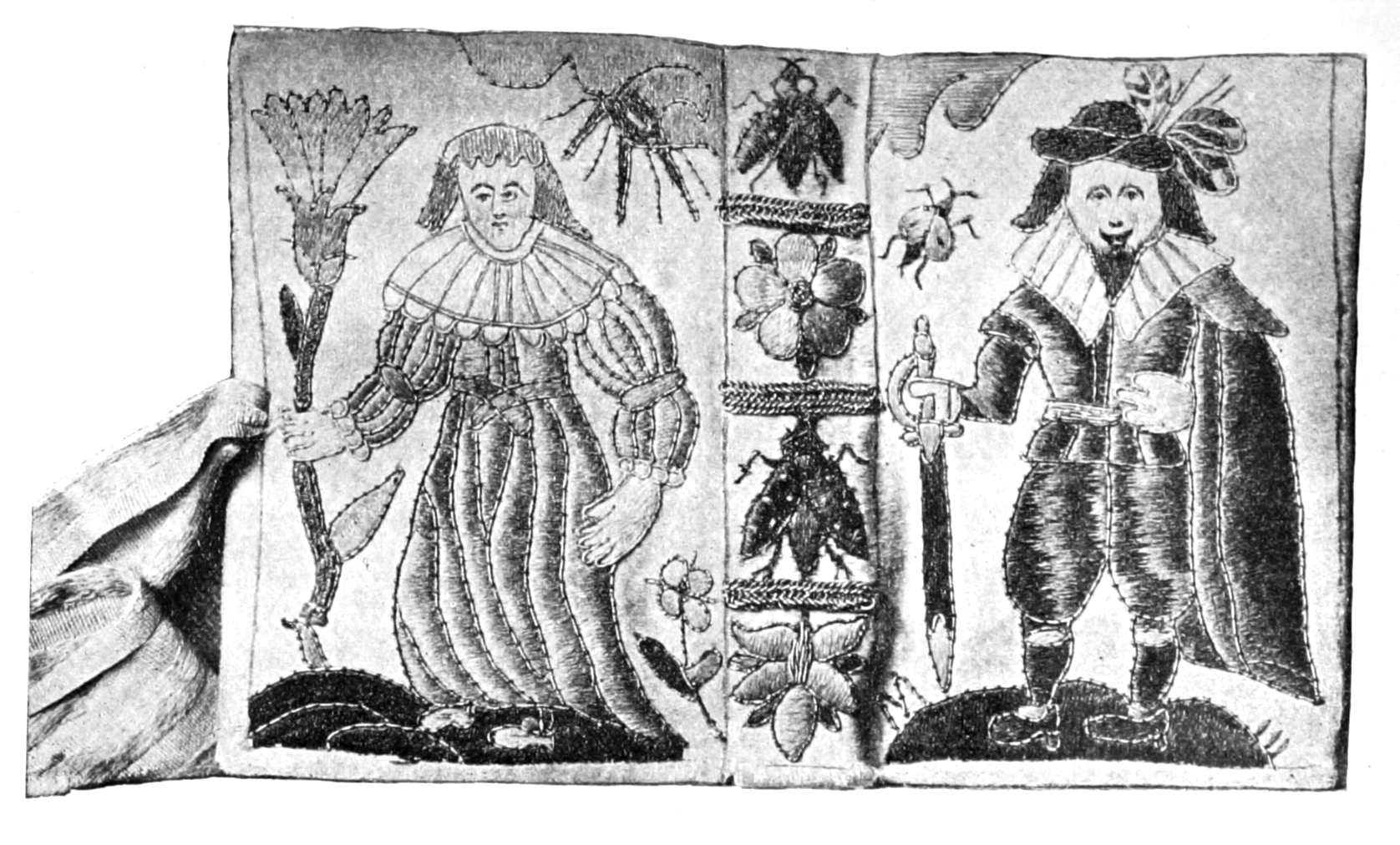 A copy of the Psalms, printed in London in 1633, is bound in white satin, embroidered in coloured silks worked in satin-stitch, and measures 3 by 2 inches. On the upper board is a gentleman dressed in the style of the period, with trunk hose of red and yellow, a short jacket of the same colouring, and a long, reddish cape. He has a broad-brimmed hat with coloured feathers, a large white collar, and a sword in his right hand. Near him is a beetle, and in the sky a blue cloud, and he is standing upon a grass mound. On the lower board is the figure of a lady in a deep pink dress, with white collar and cap. She holds a tall red lily in her right hand, and in the upper left-hand corner is a small cloud under which the sun is just appearing, and in the lower corner is a small flower. The lady is standing upon a 92 small green mound. The outlines of both figures, as well as the inner divisions between the various garments, are marked with a gold or silver thread.