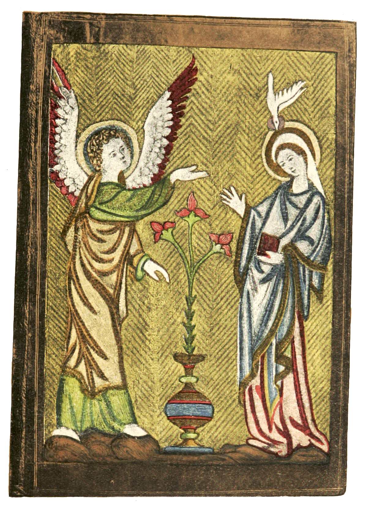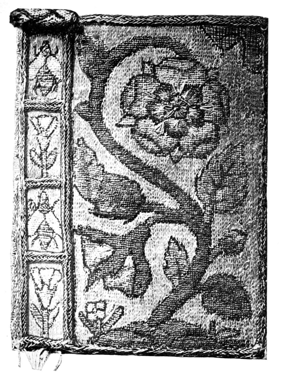 Considering the high relief in which much of this work is done, the binding is in wonderful preservation, but many of the colours are badly faded, as it has been exposed to the action of light in one of the show-cases for many years. 89Although no doubt it is advisable to expose many treasures in this way, it must be admitted that in the case of embroidered books it is frequently, if not always, a cause of rapid deterioration, so much so that I should almost think in these days of good chromo-printing it would be worth the while of the ruling powers of our great museums to consider whether it would not be wiser to exhibit good colour prints to the light and keep the precious originals in safe obscurity, to be brought out, of course, if required by students.