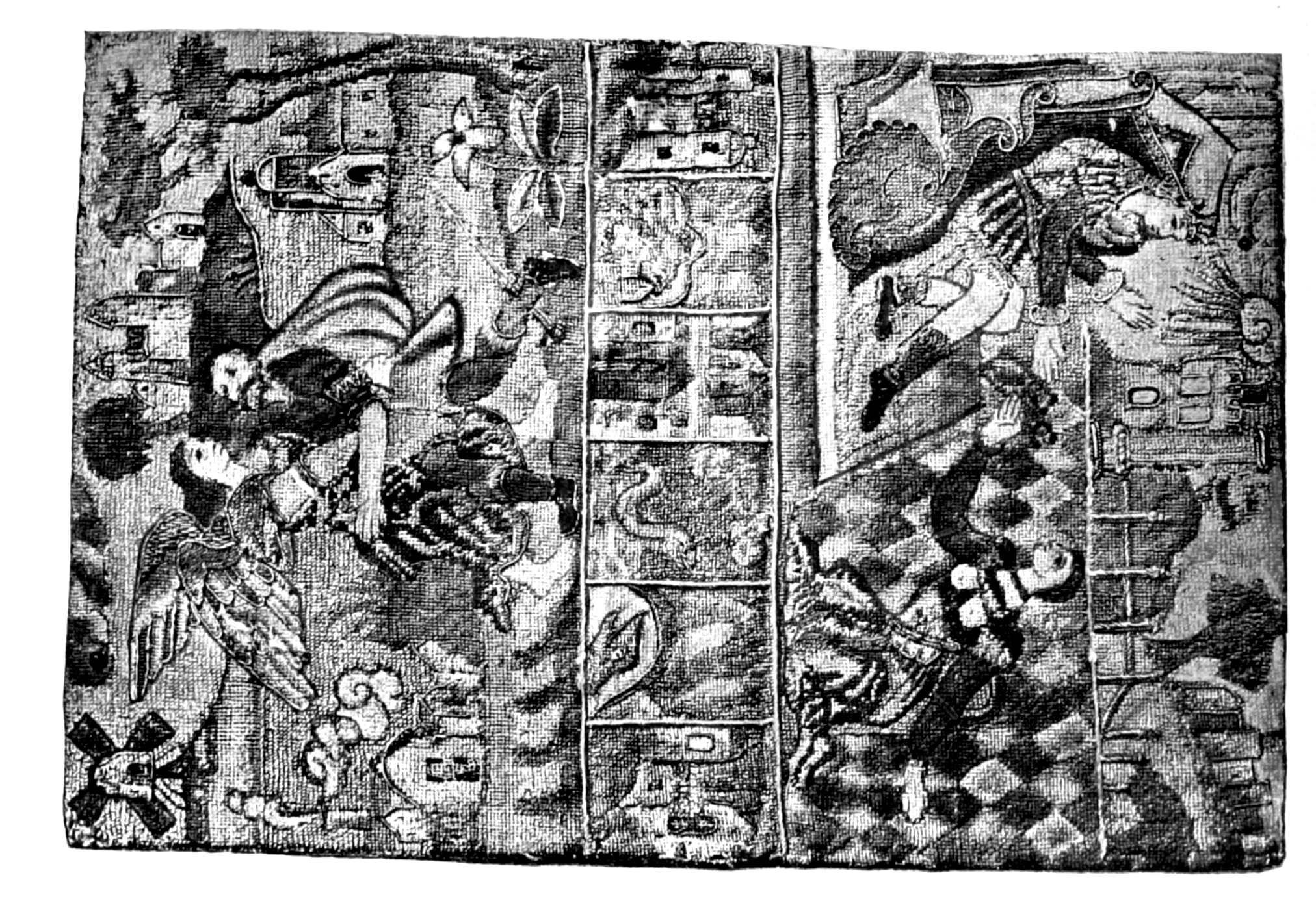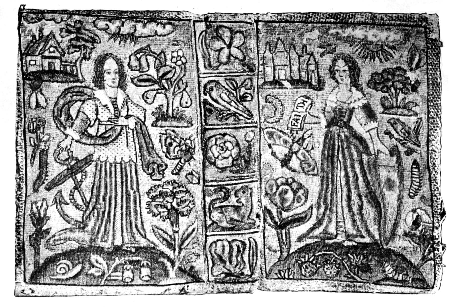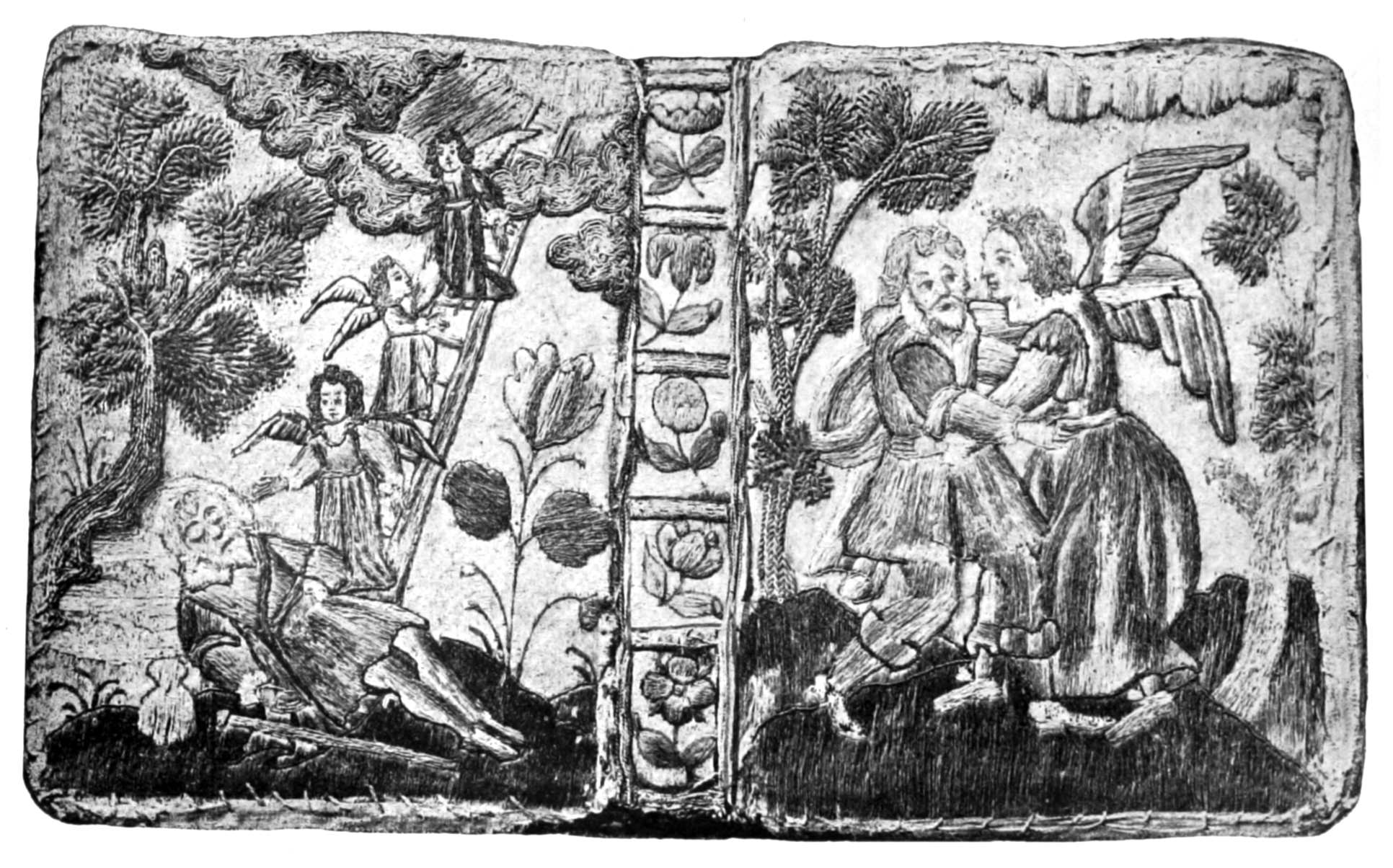 A very quaint design embroidered on white satin covers a copy of the Psalms, printed in London in 1643, and measuring 4¼ by 3¼ 106 inches. On the upper side is a representation of Jacob wrestling with the angel, flanked by two trees with large leaves; the angel has wings and long petticoats. The lower board has a representation of Jacob's dream. The patriarch is asleep on the grass, his head upon a white stone, his staff and gourd by his side. He has pale hair and beard. Behind him is a large tree, and in front a conventional flower with leaves and bud, and from the clouds reaches a ladder on which are three small winged angels, two coming down, and one between them going up. Through a break in the clouds is seen a bright space, with rays of golden light proceeding from it.