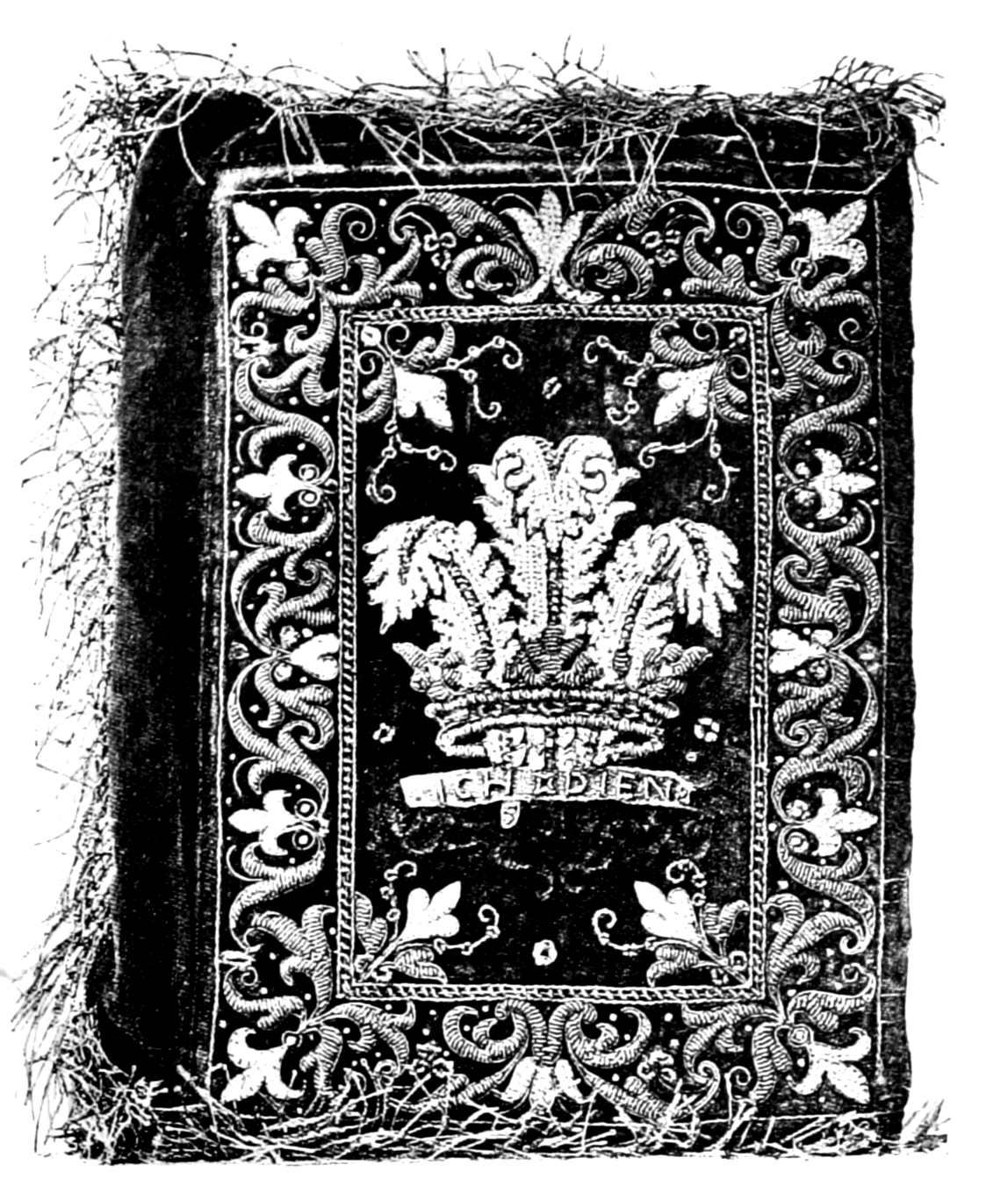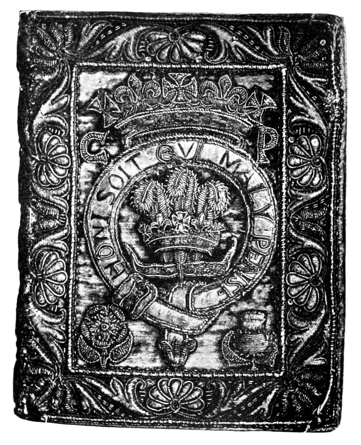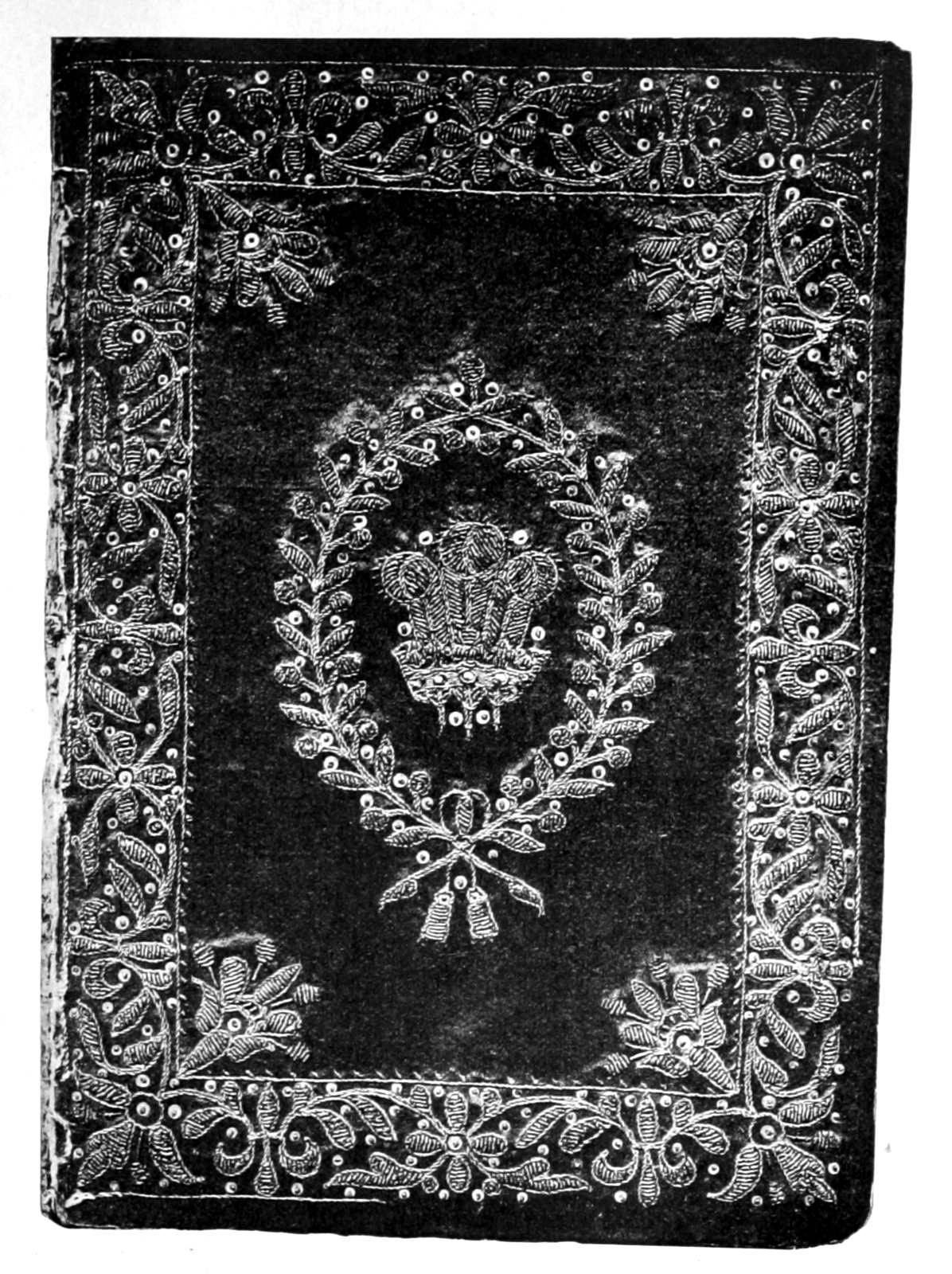 Among the few older royal books in the library at Windsor Castle is an embroidered one that belonged to Prince Charles, afterwards Charles ii. It is a copy of the Book of Common Prayer, printed in London in 1638, and is bound in blue velvet with embroidered work in gold cord and silver guimp, similar in character to that on the copy of Bacon's Essays just described. It measures 8 by 6 inches. The design is heraldic. In the centre is the triple plume of the Prince of Wales, with coronet and label, no motto being apparent on the latter. The plume is encircled by the Garter appliqué, on pale blue silk, the motto, worked in silver cord, being nearly worn off. Resting on the top of the Garter is a large princely coronet, flanking which are the letters 'C. P.' In the lower corners are a thistle and a rose. A broad border with arabesques encloses 78the central panel. This book was exhibited by Her Majesty at the Burlington Fine Arts Club in 1891. It is in very bad condition, which is curious, as it is not so very old, and as it is still among the royal possessions it might well have been imagined that it would have been better preserved than other and older books of a like kind which we know have been considerably moved about. The colour is however very charming still, and books have rarely been bound in blue velvet, black, green, or crimson being most usual.