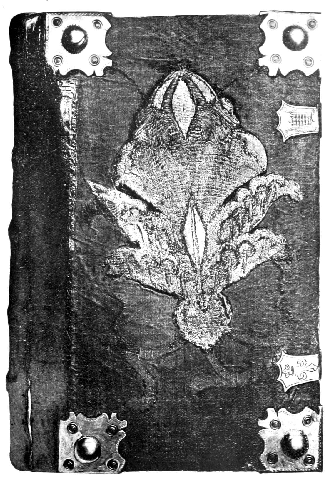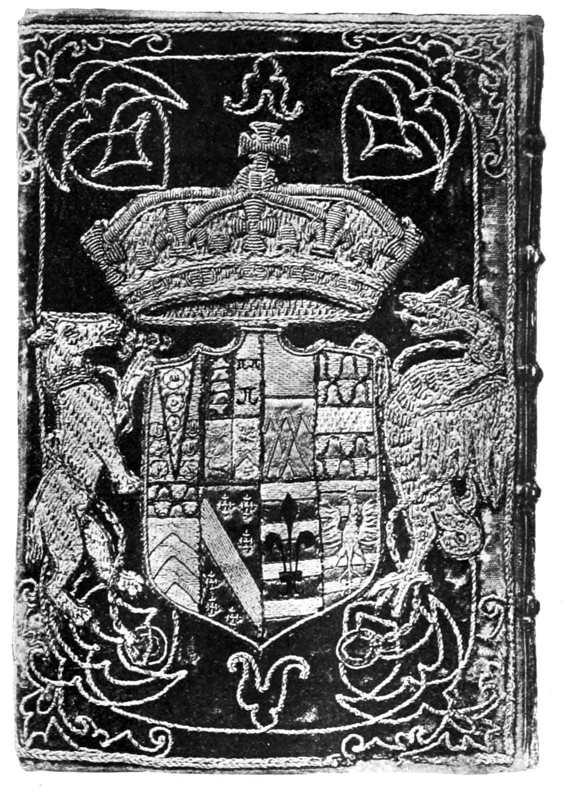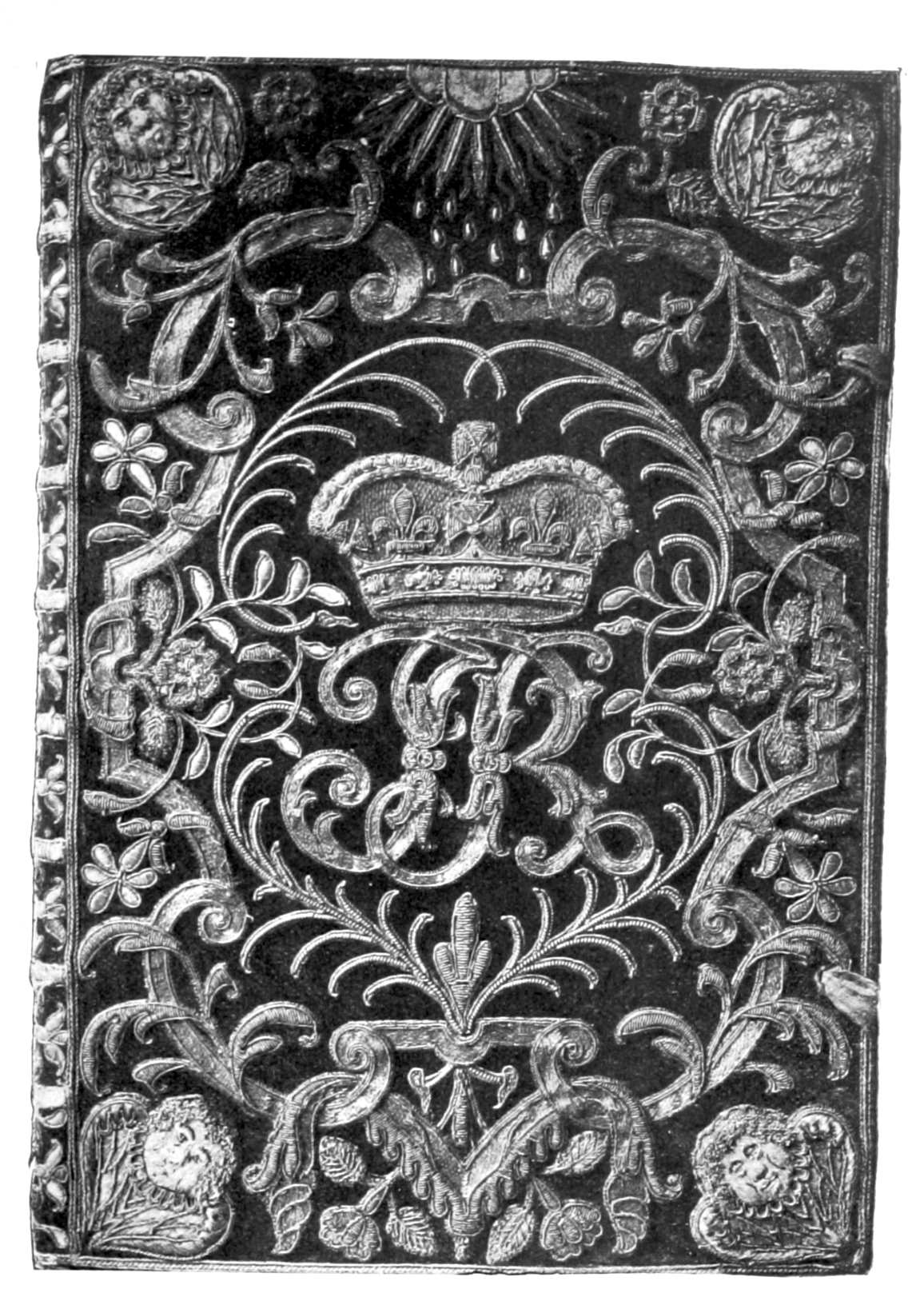 Among the few older royal books in the library at Windsor Castle is an embroidered one that belonged to Prince Charles, afterwards Charles ii. It is a copy of the Book of Common Prayer, printed in London in 1638, and is bound in blue velvet with embroidered work in gold cord and silver guimp, similar in character to that on the copy of Bacon's Essays just described. It measures 8 by 6 inches. The design is heraldic. In the centre is the triple plume of the Prince of Wales, with coronet and label, no motto being apparent on the latter. The plume is encircled by the Garter appliqué, on pale blue silk, the motto, worked in silver cord, being nearly worn off. Resting on the top of the Garter is a large princely coronet, flanking which are the letters 'C. P.' In the lower corners are a thistle and a rose. A broad border with arabesques encloses 78the central panel. This book was exhibited by Her Majesty at the Burlington Fine Arts Club in 1891. It is in very bad condition, which is curious, as it is not so very old, and as it is still among the royal possessions it might well have been imagined that it would have been better preserved than other and older books of a like kind which we know have been considerably moved about. The colour is however very charming still, and books have rarely been bound in blue velvet, black, green, or crimson being most usual.