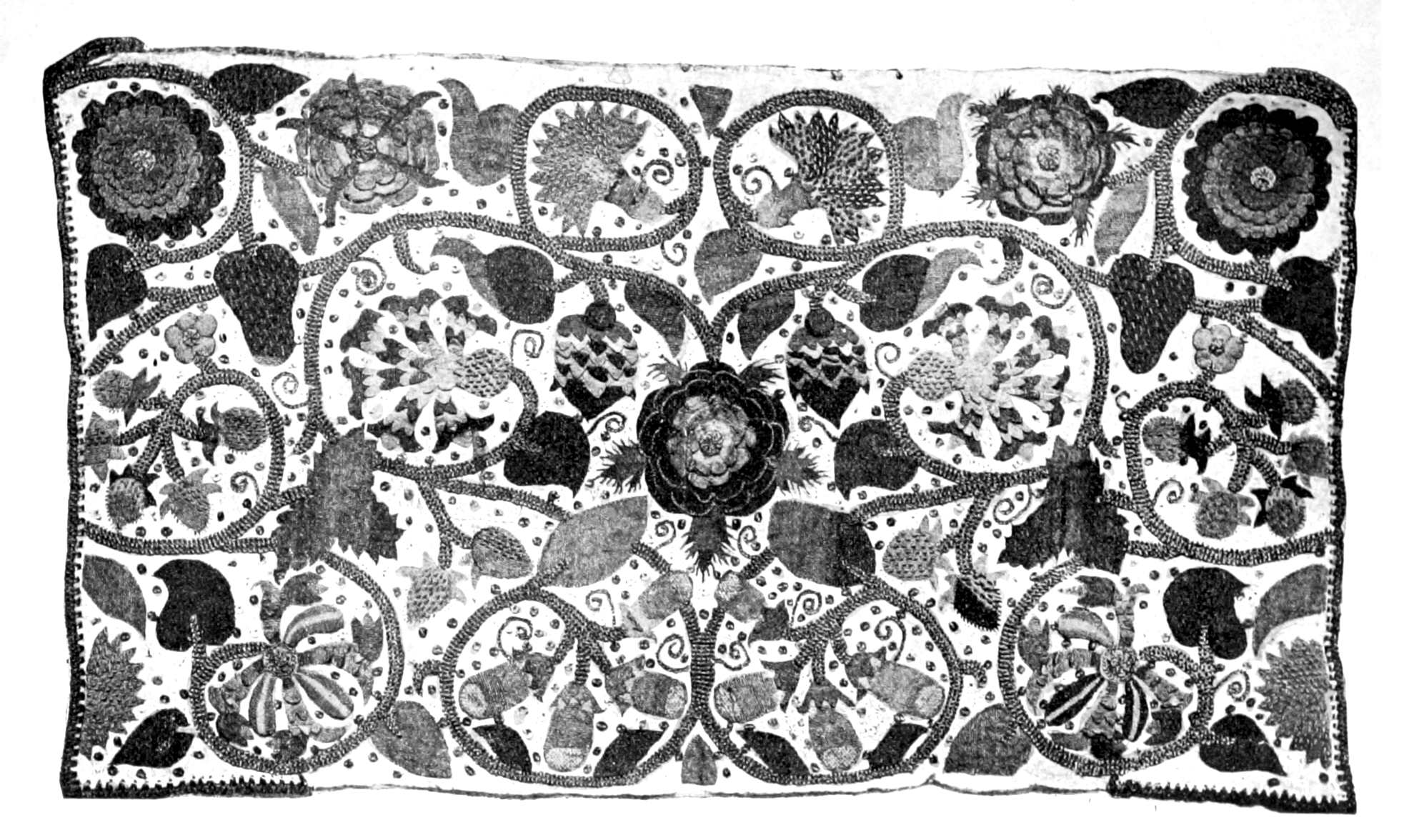 The late Lady Charlotte Schreiber, who was a great collector of pieces of old embroidery, among a host of other curious things possessed the only perfect instance of work of this kind of the seventeenth century I have ever been fortunate enough to find. It was a very realistic caterpillar, closely and completely worked with very small pieces of peacocks' feathers, sewn on with small stitches, quite confirming the opinion I had already formed as to the original filling in of the usual 'bald' spaces representing such objects.