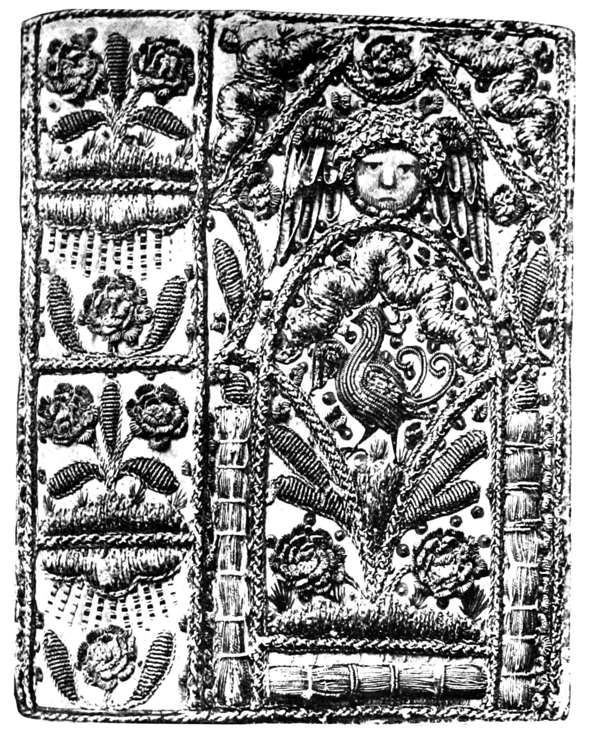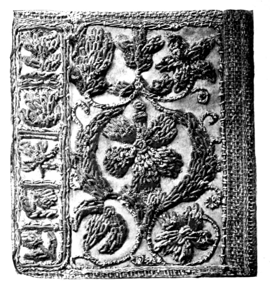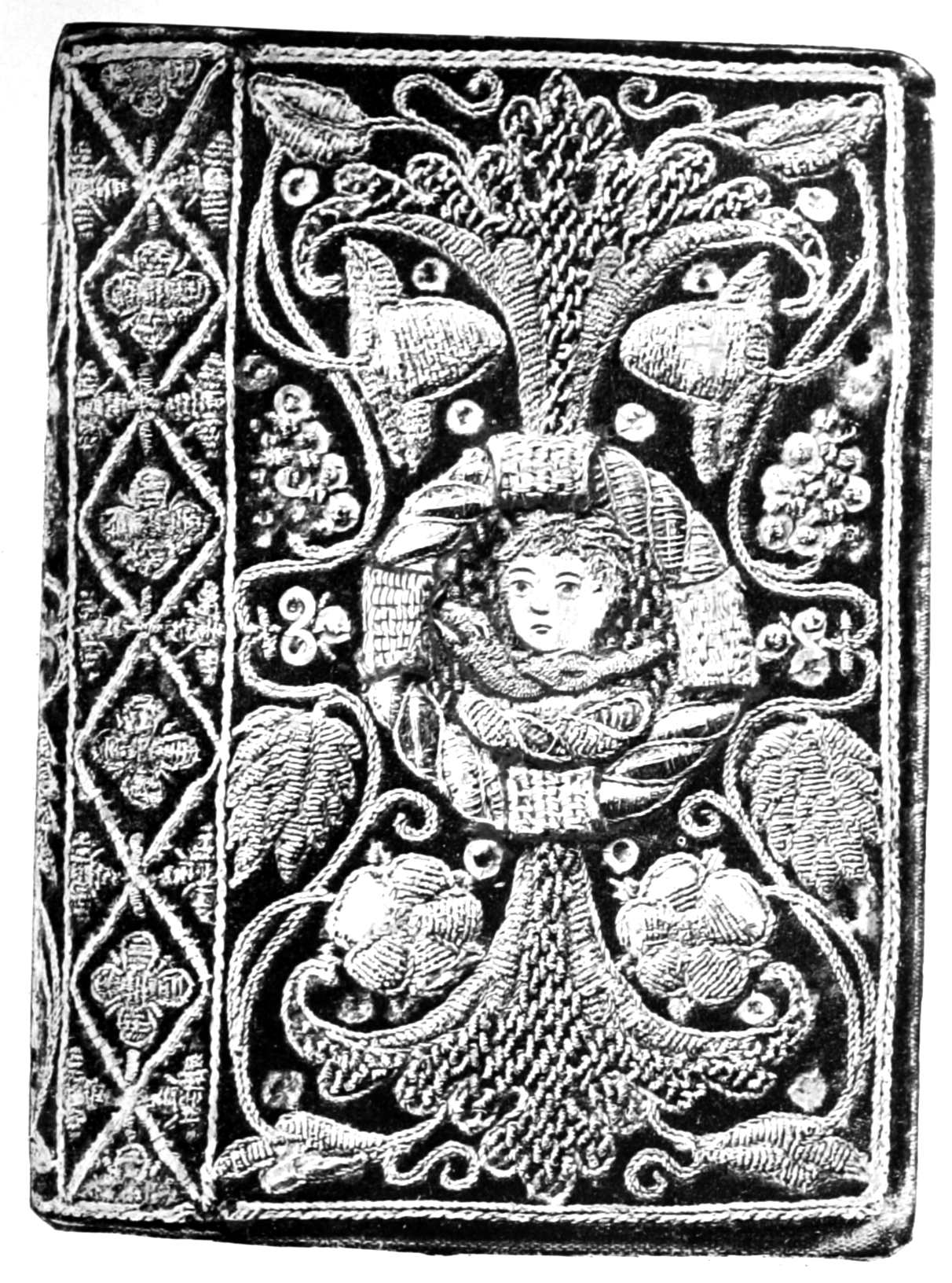 In the case of a Bible printed in London in 1638, bound in white satin, and measuring 6 by 3 inches, one of the chief ornaments is a cherub's head, the face in silver and the hair and wings in gold. The working of this head and wings seems to me wrong. The face is, possibly enough, as well done as the material would allow, but the hair is made in small curls of gold thread, and the feathers of the wings are rendered in a naturalistic way with pieces of flat gold braid. This kind of realism is out of place in embroidery, and it is unfortunately characteristic of the English embroidered work of about this period, occurring generally on boxes, mirror frames, or the like, but only rarely on book-covers. The design is the same on both sides; a narrow arch of thick gold cord reaches about three-quarters up the side, and interwoven with it is a kind of cusped oval, with leaves, reaching up to the top of the book. The lower half of the arch97 is enclosed in a rectangular band of silver threads, broad and kept in place by transverse bars at regular intervals, and beyond it another row, made of patches of red and blue silk alternately. In the lower part of the oval is a ground of green silk, on which grow two double roses made of red purl. In the space enclosed between the top of the arch and the lower point of the oval is a bird worked in high relief in gold with a touch of red silk on his wings. Over the bird is a blue cloud, heavily worked in blue silk, and beneath is a small grass plot. The cherub's head already described is in the space between the top of the arch and the upper extremity of the oval; it is flanked by two small red purl roses. The two upper corners have undulating clouds in blue silk, and a red and yellow purl rose between them. There are several gold spangles all about, and innumerable small pieces of coloured purl.