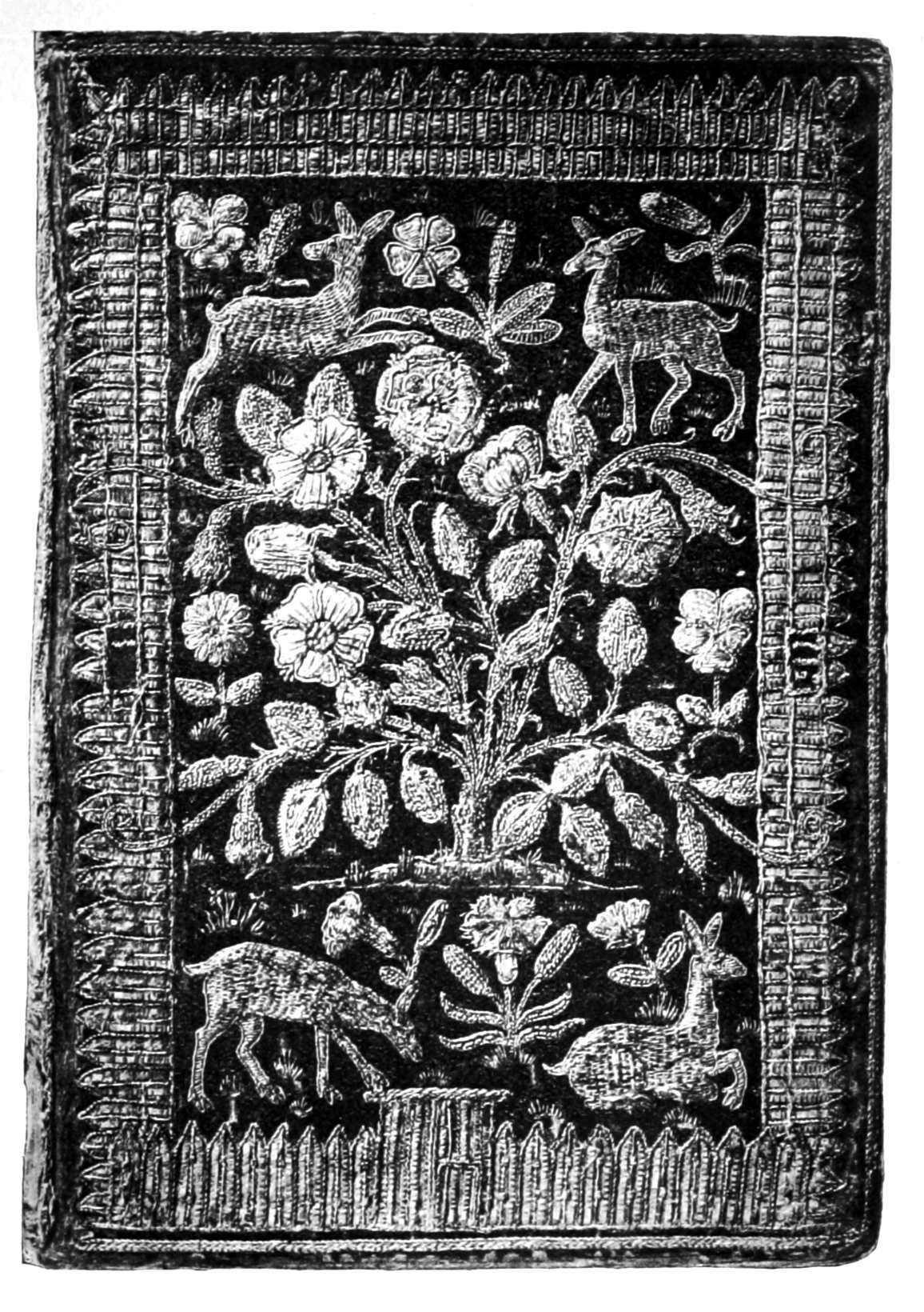 The back is divided into nine panels, each containing an arabesque ornament worked in gold cord and thread, the first and last panels being larger than the others and containing a more elaborate design. The edges of the leaves are simply gilt, and the boards measure 18 by 12 inches each, the largest size of any embroidered book known to me.
