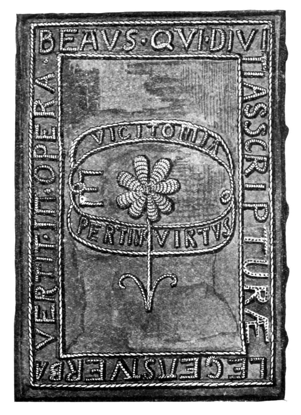 On both covers borders with legends in Latin, enclosed in lines of gold cord, run parallel to the edges. Beginning at the right-hand corners of each side, these legends read, 'Beatus qui divitias scripturæ legens verba vertit in opera—Celum Patria Scopus vitæ xpus—Christus via—Christo vive.' In the centre of the upper side is a ribbon outlined in gold cord, with the words, 'Eleva sursum ibi ubi,' a heart being enclosed within the ribbon, and a long stem with a flower at the top passing through it. In the centre of the lower side a similar ribbon with the motto, 'Vicit omnia pertinax virtus,' encloses a daisy, a badge previously 65used by Henry viii. and Edward vi., probably in memory of their ancestress, Margaret Beaufort. Both these inner scrolls have the initial letter E interwoven with them.