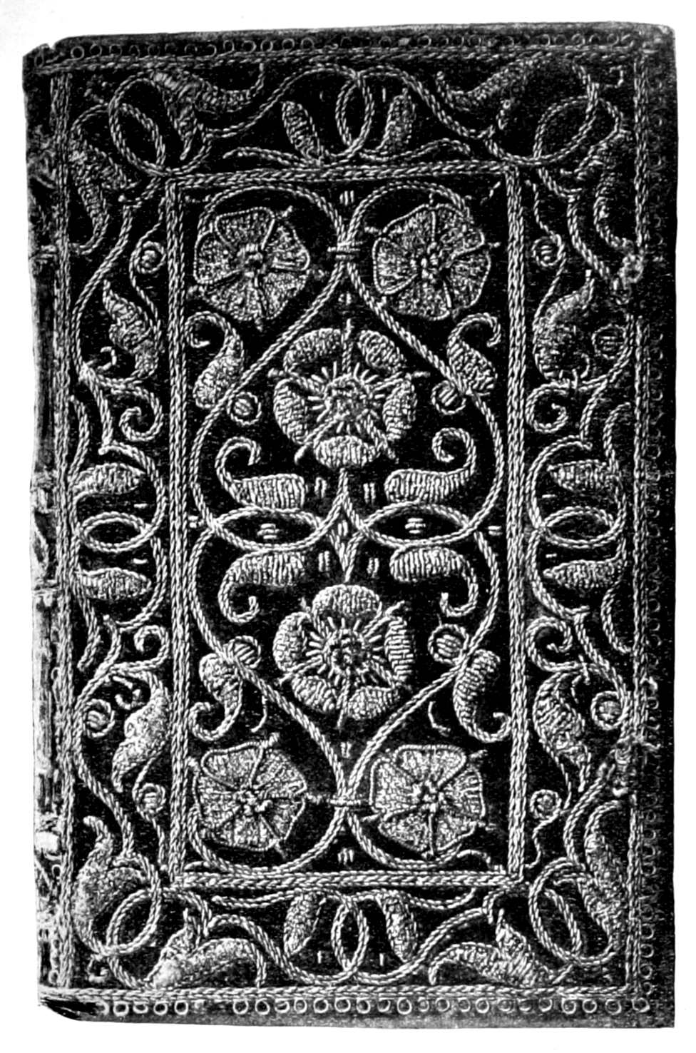 There is in the British Museum a copy of Orationis Dominicæ Explicatio, per Lambertum Danæum, printed at Geneva in 1583, which belonged to Queen Elizabeth. It is bound in black velvet, measures 6¾ by 4¼ inches, and is ornamented most tastefully, each side having an arabesque border in gold cord and silver guimp, enclosing a panel with a design of white and red roses, with stems and leaves worked in gold cord and silver guimp with a trifle of coloured silk on the red roses and on the small leaves showing between the petals. On the front edge are the remains of red and gold ties. The design of this charming little book is excellent, and the colour of it when new must have been very effective. The design is the same on both sides. The back is in bad condition, and is panelled with arabesques in gold and silver cord.