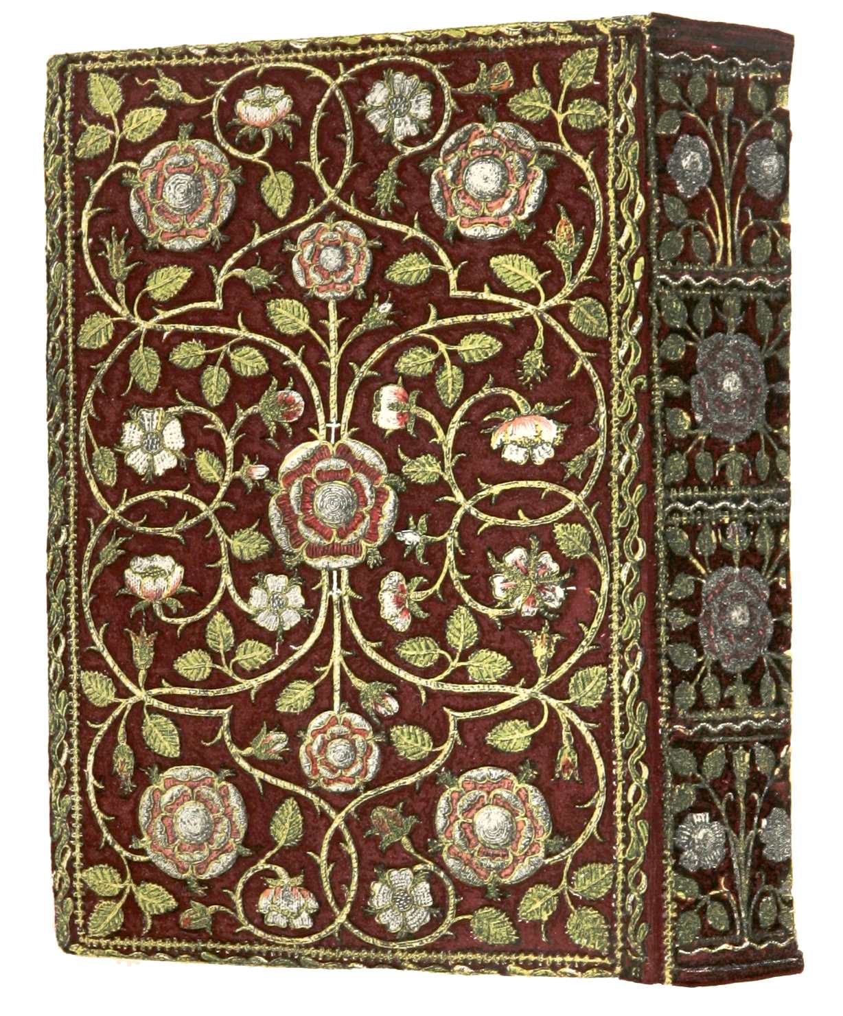 This is one of the embroidered books that belonged to Queen Elizabeth, and has been frequently illustrated and described. It is remarkable in other respects than for its binding, as it is one of a number of probably not more than twenty copies of a work by Matthew Parker, Archbishop of Canterbury, De antiquitate Ecclesiæ Britannicæ, printed for him by John Day in London, 1572. It was the first instance of a privately printed book being issued in England.