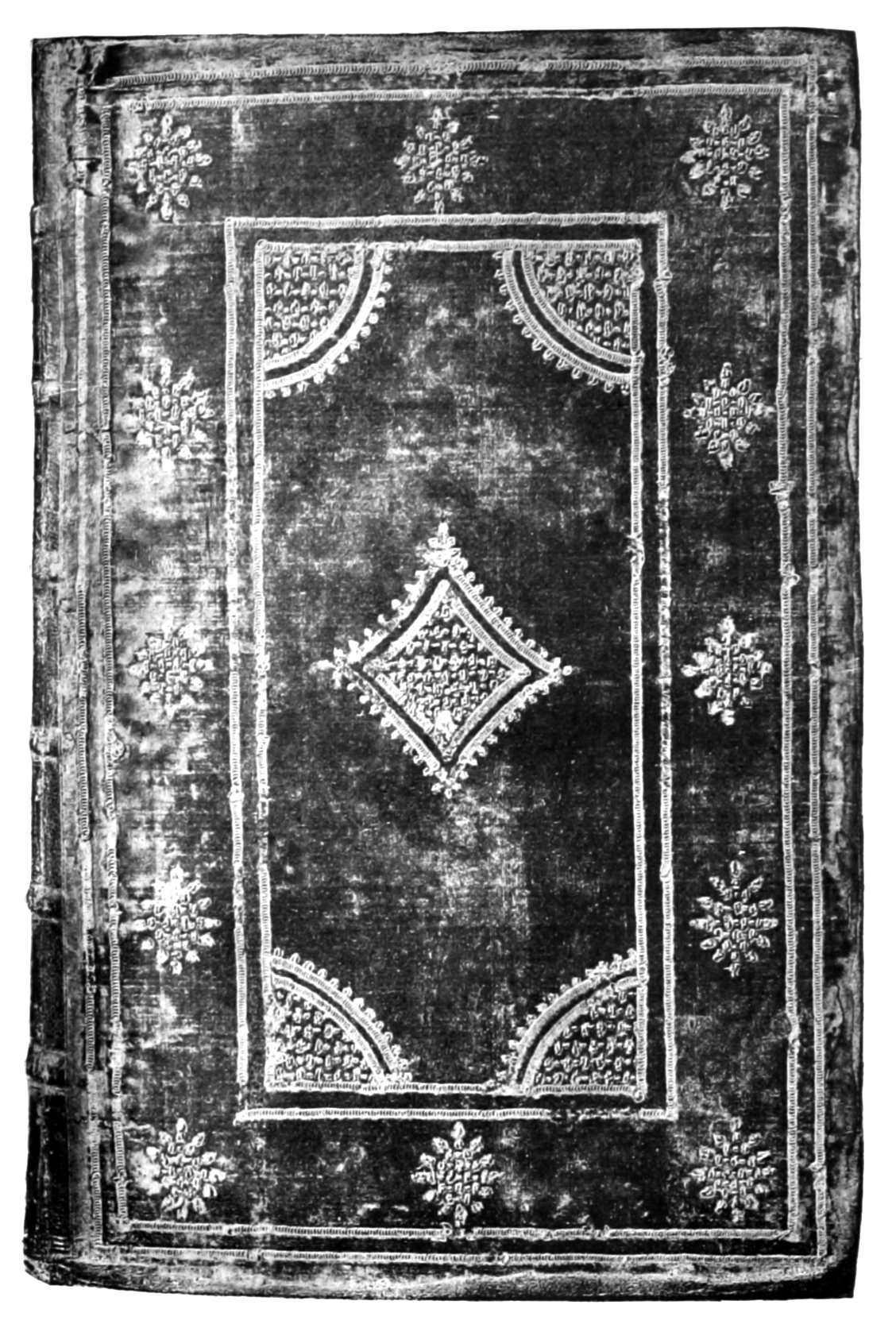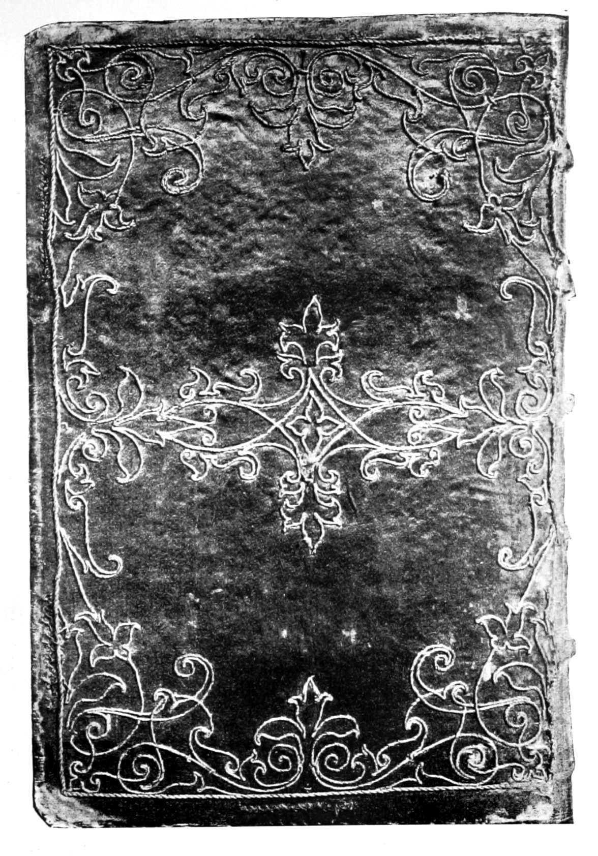 erhaps the earliest existing English book bound in satin is a collection of sixteenth-century tracts that belonged to Henry viii., and is now part of the Old Royal Library in the British Museum. It is covered in red satin, measures 12 by 8 inches, and is embroidered in an arabesque design, outlined with gold cord. On the edges the words 'Rex in aeternum vive Neez' are written in gold. The word 'Neez' or 'Nez,' as it is sometimes spelt, may mean Nebuchadnezzar, as the other words were addressed to him. On books bound in leather by Thomas Berthelet, royal binder to Henry viii. and his immediate successors, the motto often occurs, and as he is known to have bound books in 'crymosyn satin,' this is most likely his work. The pattern 81is worked irregularly all round the boards, and a sort of arabesque bridge crosses the centres. The back is new, and of leather, but the boards themselves are the original ones, and the embroidery is in a very fair condition.