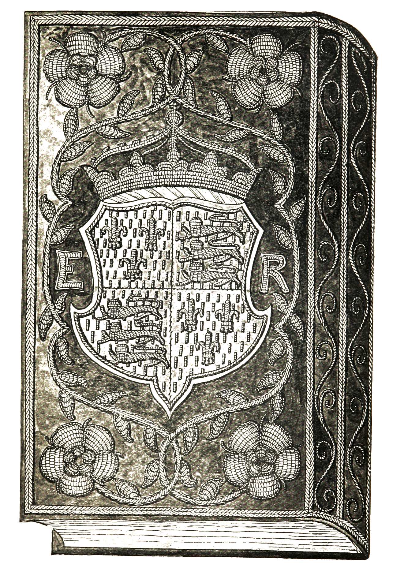 A few specimens of embroidered books were exhibited at the Burlington Fine Arts Club in 721891. Among them was a charming velvet binding that belonged to Queen Elizabeth, lent by S. Sandars, Esq., and now in the University Library, Cambridge. It is a copy of Udall's Sermons, printed in London in 1596, and is covered in crimson velvet, measuring about 6 by 4 inches. The design is the same on each side, the royal coat-of-arms appliqué, with the initials E. R., and a double rose in each corner with stalks and leaves. The coat-of-arms is made up with pieces of blue and red satin, the bearings heavily worked with gold thread, and the ground also thickly studded with small straight pieces of guimp, doubtless put there to insure the greater flatness of the satin. The crown with which the coat-of-arms is ensigned is all worked in guimp, and is without the usual cap. The ornaments on the rim are only trefoils, and there are five arches.
