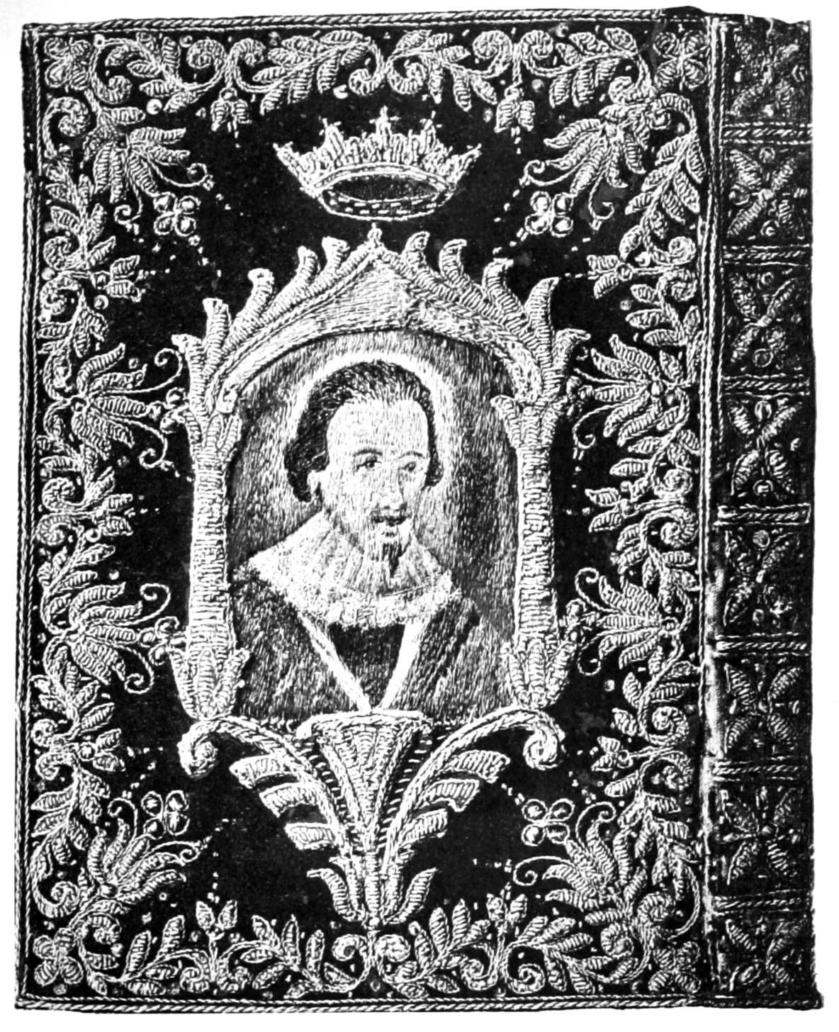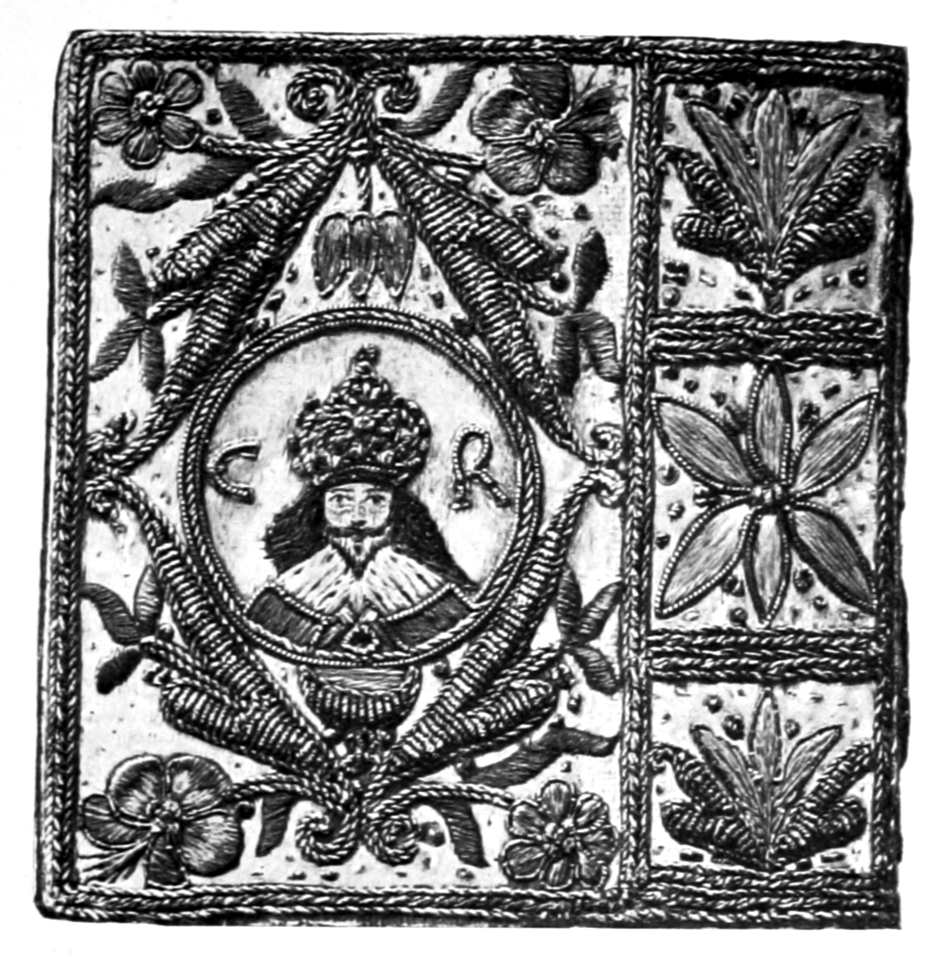 Another copy of the Psalms, printed in London in 1643, bound in satin, and measuring 3¼ by 2¼ inches, bears on each side, within a circle, a miniature portrait of Charles i. worked in feather-stitch. The king wears long hair, moustache, and small pointed beard. He is 107 crowned, and has a red cloak with miniver tippet, from under which appears the blue ribbon of the Garter worn round the neck, as it originally was, and having a small gold medallion attached to it. The initials C. R. in gold guimp are at each side. The circle is enclosed in a strong framework of silver cord and guimp in the form of four thin long pointed ovals of leaf form arranged as a diamond. The four triangular spaces between the diamond and the oval are filled with small flowers or small pieces of guimp and spangles. Towards each corner grows a flower, two pansies, and two others with regular petals. The remaining spaces are filled variously with green leaves, small patches of purl and gold spangles, and a strong gold cord encloses the whole. The back is divided into three panels, in each of which is an ornamental conventional flower, the upper and lower ones alike, and worked in shades of red with guimp leaves in relief, and the centre one with six petals worked in yellow and edged with a fine gold cord. There are no signs of ties ever having existed, and the edges of the leaves are gilt and slightly gauffred. It has been suggested that this little book may have belonged to King Charles i.; but the fact of his portrait being upon it is no proof of this, as portraits of this king are more numerous upon the bindings of English books than those of any other person.