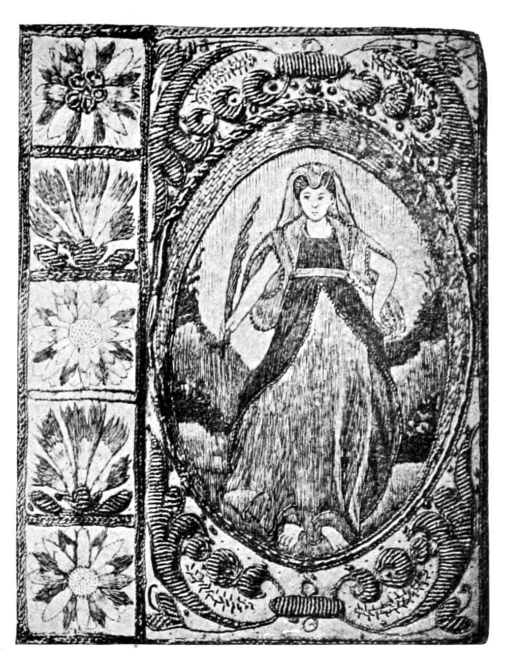 A copy of a Bible, printed in London in 1619, is bound in white satin, and measures 6 by 3½ inches. On each side is an emblematic figure enclosed in an oval; the figures are different, but their surroundings are alike. On the upper side a lady holding a palm branch in her right hand is worked in shading-stitch. She is full length, and wears an orange skirt with purple robe over it confined by a blue belt, and over her shoulders a pink jacket—all these garments are outlined by a gold cord. Her fair hair is covered by an ornamental cap of red and gold, and her feet are bare.